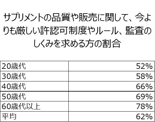 6割以上のユーザーが今よりも厳しい許認可制度やルール、監査のしくみを求めており、年齢が高いほどこれらを求めるユーザーが多い。また、サプリメントの成分等が簡単に確認できるもの、健康被害の事例が簡単かつ分かりやすく参照できるものを求めるユーザーも多い。
