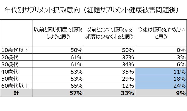 サプリメントユーザーの42%が今回の問題を契機に摂取頻度を少なくするか摂取を止めたいとの意向があり、年齢が高いほど摂取をやめたいとするユーザーが多い。