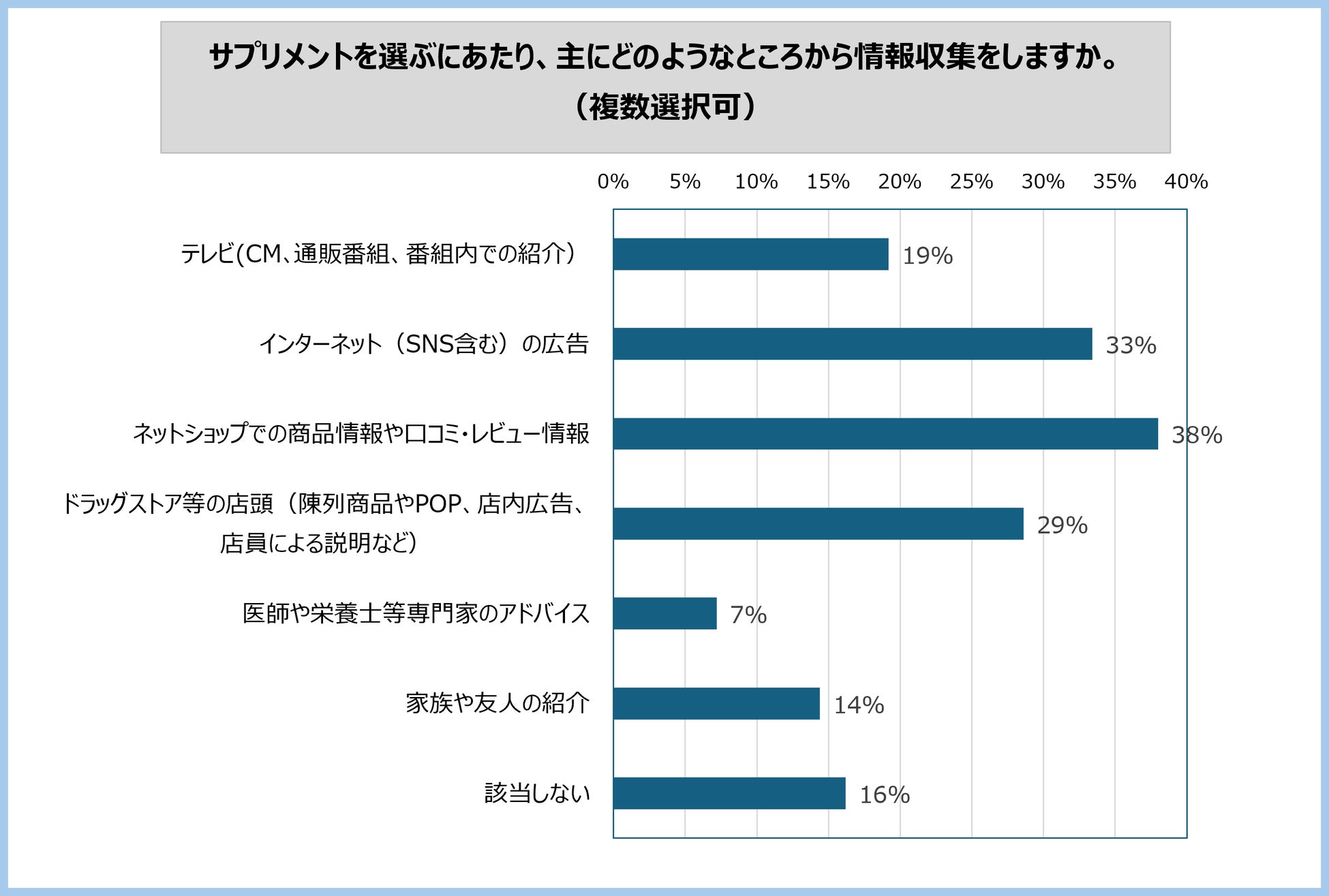 サプリメントに関する情報源は、「ネットショップでの商品情報や口コミ・レビュー情報」、「インターネット広告」、「ドラッグストア等の店頭」がそれぞれ38%、33%、29%と上位を占め、「医師や栄養士等専門家」を情報源とする方は7%と少数にとどまっています。