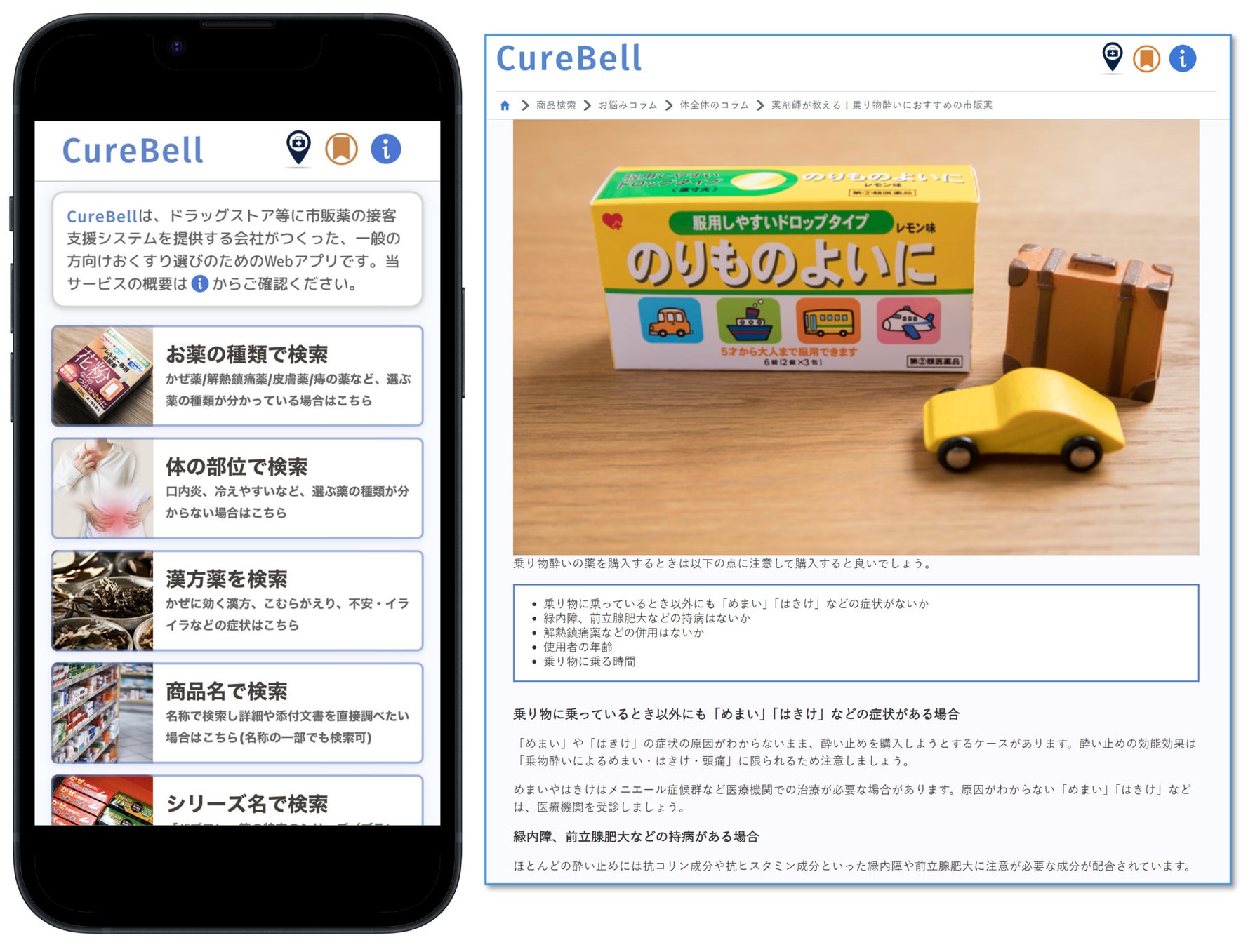 CureBell(キュアベル)を用いると、様々な症状やニーズに応じて、生活者が自らに合った市販薬(OTC)を探すことができます。症状や既往歴による検索のほか、妊娠中の方や小児が服用可能な市販薬も簡単に選定できます。CureBellは、薬剤師や登録販売者、看護師等の医療従事者にも活用されています。