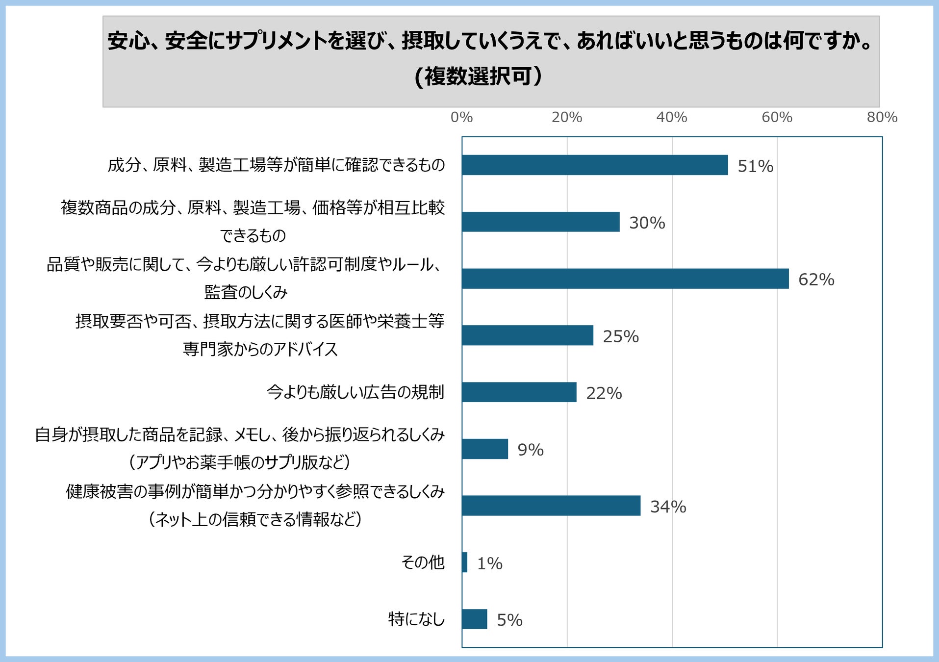 また、「成分、原料、製造工場等が簡単に確認できるもの」「健康被害の事例が簡単かつ分かりやすく参照できるしくみ」を求める声はそれぞれ51%、34%に上ります。