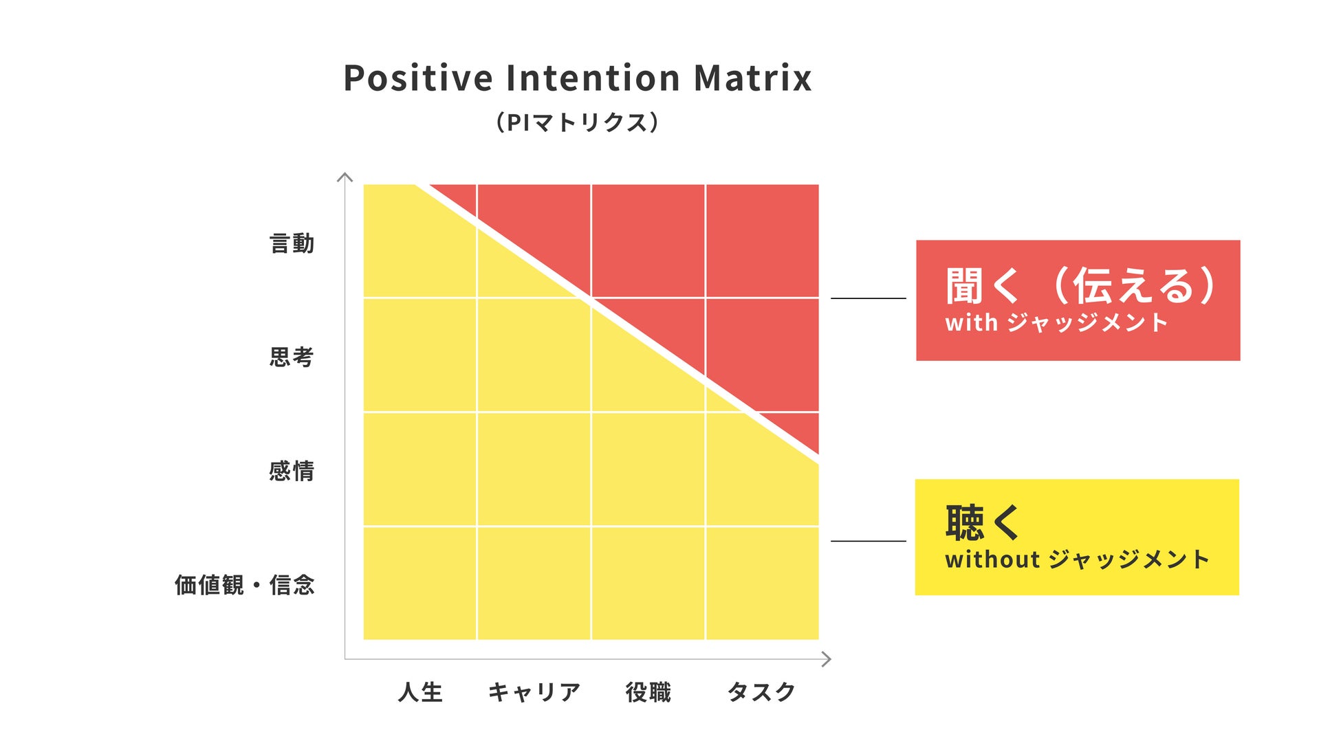 一例として、以下の図は管理職の方々のご相談を多く受けてきた櫻井さんが得た知見から作成した「PIマトリクス」です。縦軸に「価値観・信念」「感情」など、横軸に「人生」「キャリア」などを置き、話のテーマには、それぞれ聴くこと・伝えることに適した領域があることを説明しています。
