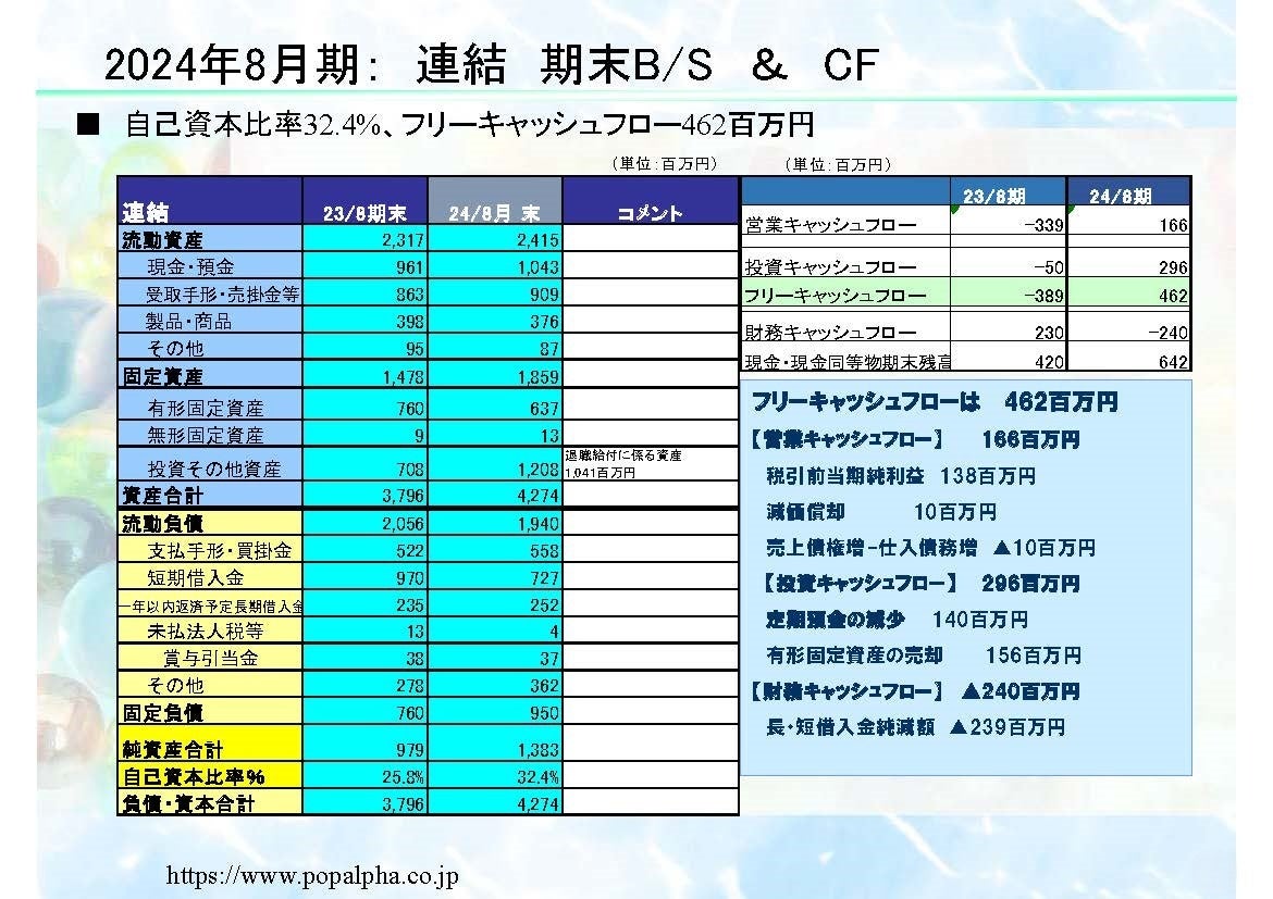 当社は、黒字化を達成したことにより、自己資本比率が32.4%まで回復し、財務基盤の安定化が進んでおります。営業キャッシュフローはプラス1億6千6百万円、投資キャッシュフローはプラス2億9千6百万円となり、結果としてフリーキャッシュフローはプラス4億6千2万円を達成しました。また、期末時点での現金および現金同等物の残高は6億4千2百万円となり、十分な流動性を確保しております。