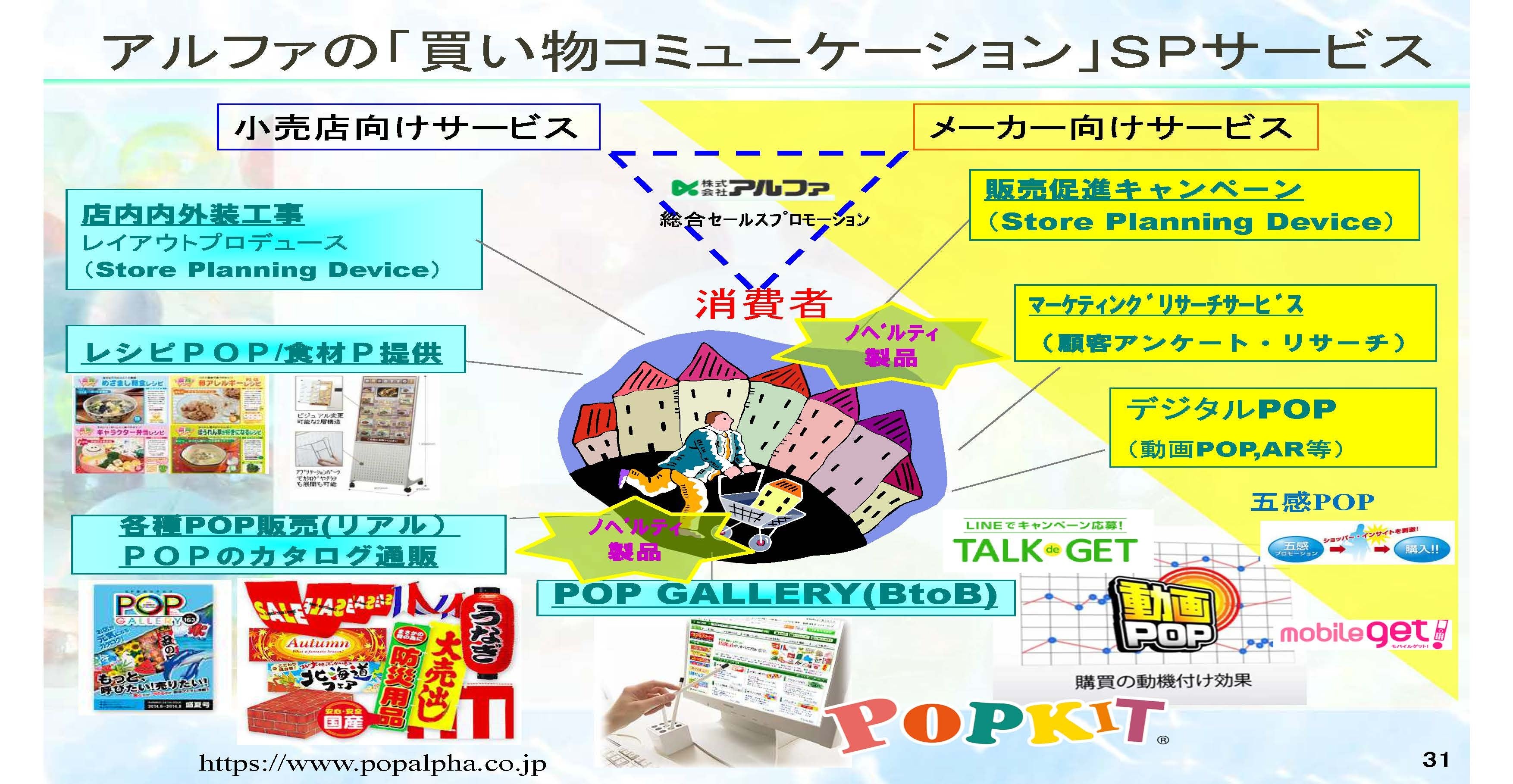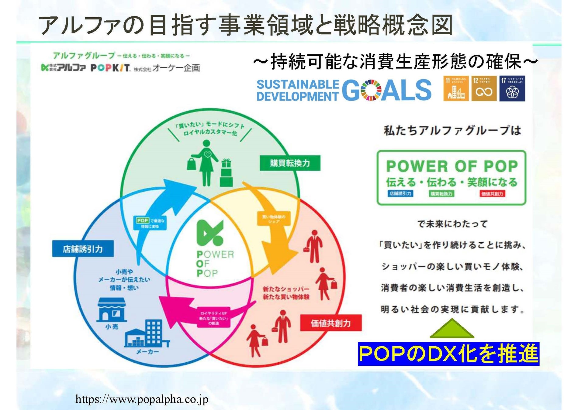 当社アルファグループのビジョンである「伝える・伝わる・笑顔になる」の実現に向け、「POWER OF POP」をコンセプトに、消費者が「買いたい」と思う体験を提供し続けることにチャレンジしています。「POWER OF POP」とは、消費者の購買行動に基づく「店舗誘引力」「購買転換力」「価値共創力」の3つの力を駆使し、顧客に「買いたい」と感じていただける事業活動を指します。これにより、私たちは持続可能な地域社会の実現に貢献してまいります。
