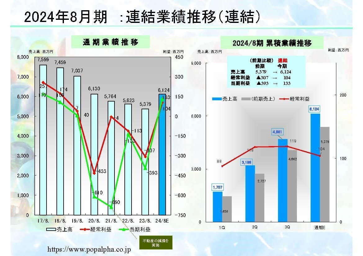 2024年8月期通期決算を2024年10月11日に発表しました。売上高は61億2千4百万円、経常利益は1億4百万円となり、前期の▲307百万の赤字から黒字転換を果たしました。この結果は、経営の立て直しに向けた取り組みが功を奏したことを示しています。引き続き、収益基盤の強化に努め、企業価値の向上を目指してまいります。