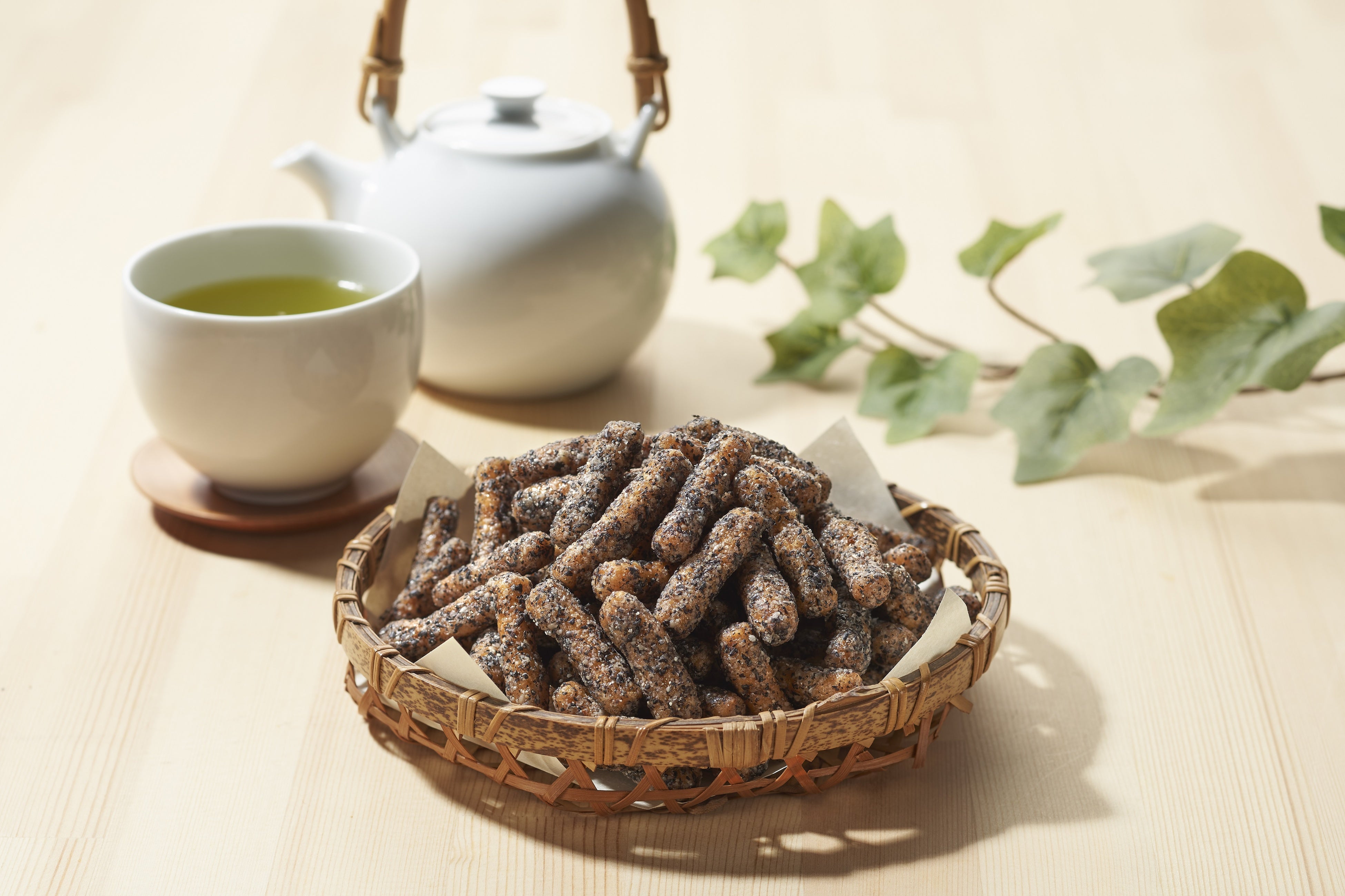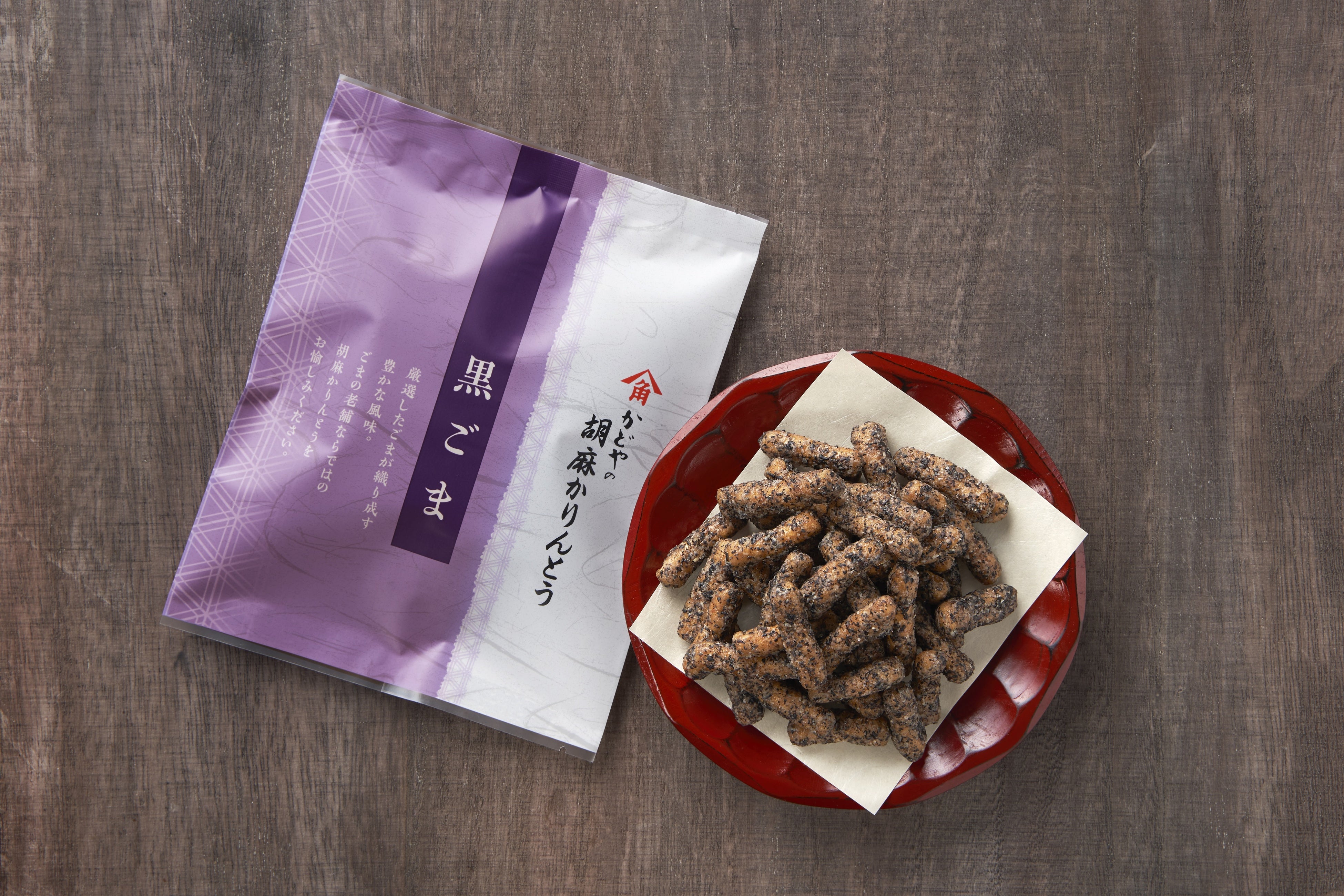 これまでかどやの通信販売では、ごまをたっぷり使ったごま煎餅「胡麻黒丸・胡麻白丸詰合せ」や、なめらかなペースト状の黒ごまをふんだんに使用した「黒胡麻プリン」など、オンライン限定商品を販売してきました。おかげさまで多くのお客様に好評いただく中で、「ごまをもっと気軽に楽しんでいただけるお菓子をお届けしたい」との想いから、日本の伝統菓子でありながら、日常的なお菓子としても親しまれているかりんとうの開発をスタートさせました。古来より長寿食・健康食としても重宝されてきたごまを、伝統の製法を守りながらも、今の時代に合わせて挑戦を続けている老舗かりんとうメーカー金崎製菓株式会社様の協力のもと、ごまの旨味、風味を存分に愉しめる逸品に仕上げました。