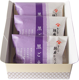 かどや厳選の胡麻の魅力を引き出すため、優しい甘みの中に塩味をほんのりきかせて、洗練された味わいに。ごまの香ばしさと風味、旨味で飽きのこない味わいで「もう一つ、あと一つ」と思わず手が伸びてしまいます。子供からお年寄りまでどなたでもお楽しみいただけるおいしさです。