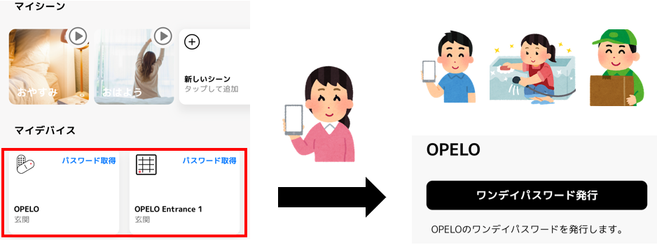入居者はHOMETACTから簡単にOPELOのワンデイパスワードが発行でき、家族や来訪者にシェアしたり、家事手伝いや配達などのサービス利用時に使用することが可能です。
