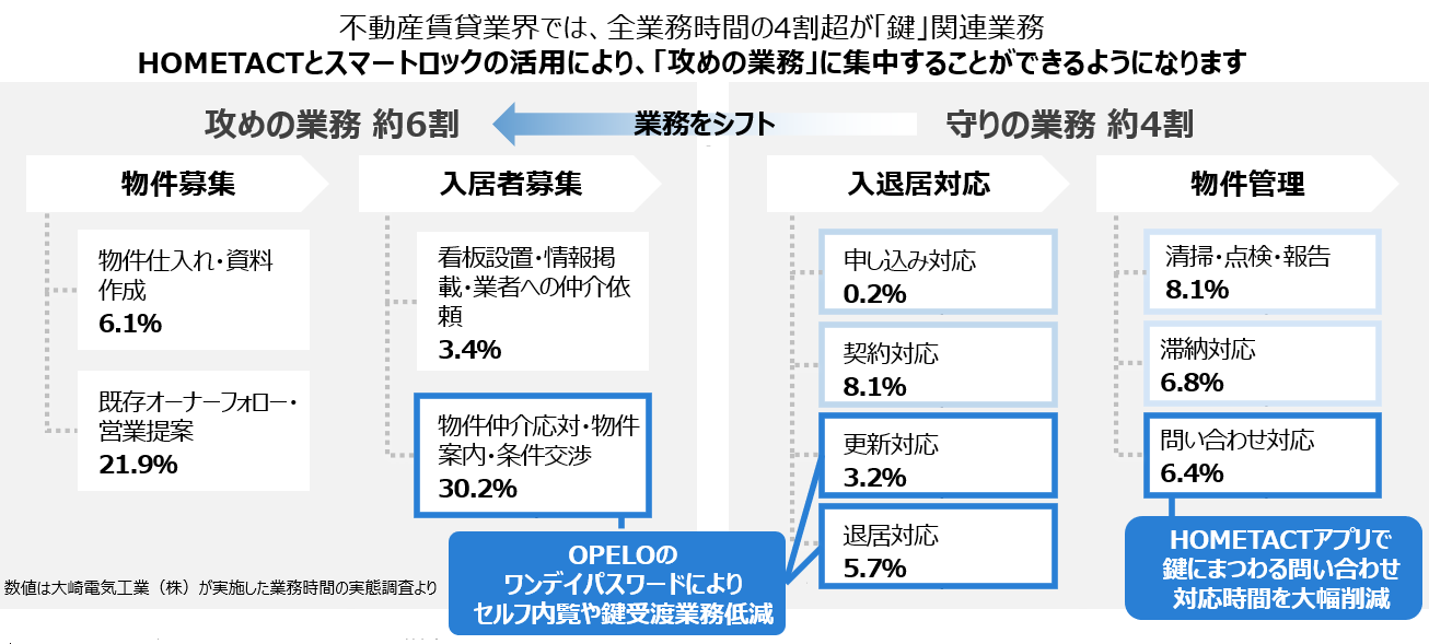 不動産賃貸業界では、鍵に関する問い合わせ対応、更新・退去対応などの「守りの業務」に加え、内覧物件案内など実物鍵を取り扱うことによる業務非効率が業界の課題となっています。HOMETACTとOPELOの協業により、賃貸管理会社はHOMETACT管理画面(TACTBASE)のパスワード管理機能を活用し、お客様によるセルフ内覧対応、入退去時の鍵の交換業務やペーパーレスでのスマートロック利用案内など、非常に煩わしい実物鍵を中心とする業務を大幅に効率化することが可能で、物件募集や入居者募集などの「攻めの業務」に集中することができるようになります。今後も2社の協働により不動産DXを基軸としたサービス拡充を進めていくことで、業界全体の課題解決に向け、ソリューションを進化させていきます。