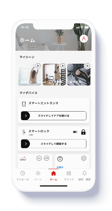 - 「おはよう」「行ってきます」といった「シーン」の設定や、時間や位置情報などをトリガーとする「マイルール」の設定で、複数のIoT機器をまとめて動かし、設定どおりの住空間の制御が可能