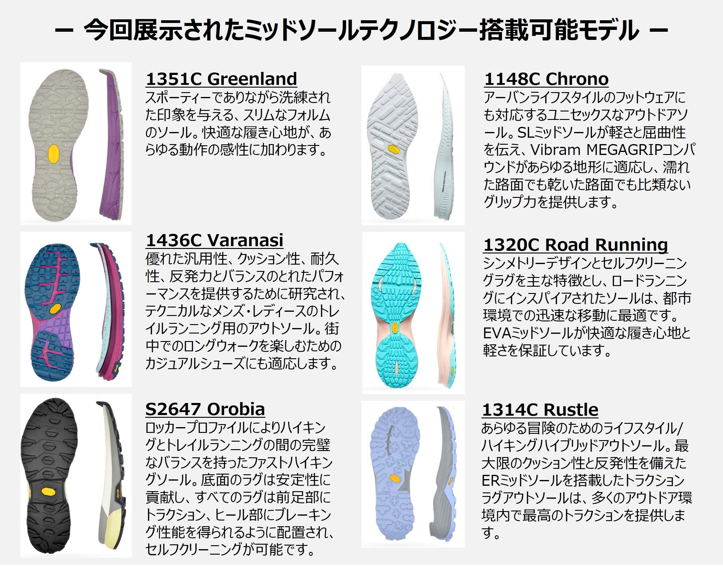 今回の出展にあたりヴィブラムでは、コンセプトモデルとしてプロトタイプコレクションを制作し、「ソールシステム」と「SS24コレクション」の2つのテーマにて製品の展示を行いました。