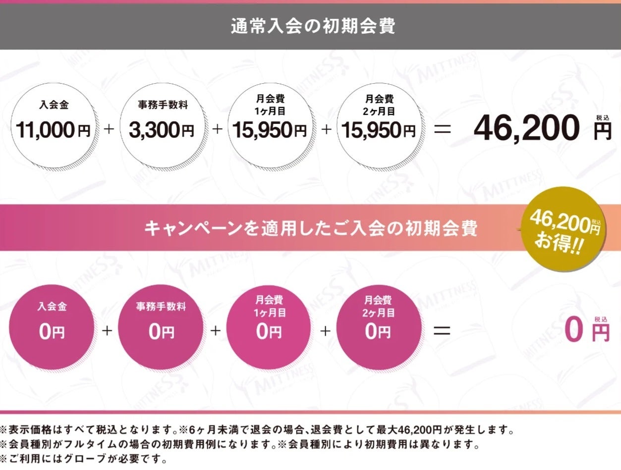 ※会員種別がフルタイムの場合の初期費用例になります。※会員種別により初期費用は異なります。※1度退会された再入会のかたもキャンペーン対象となります。