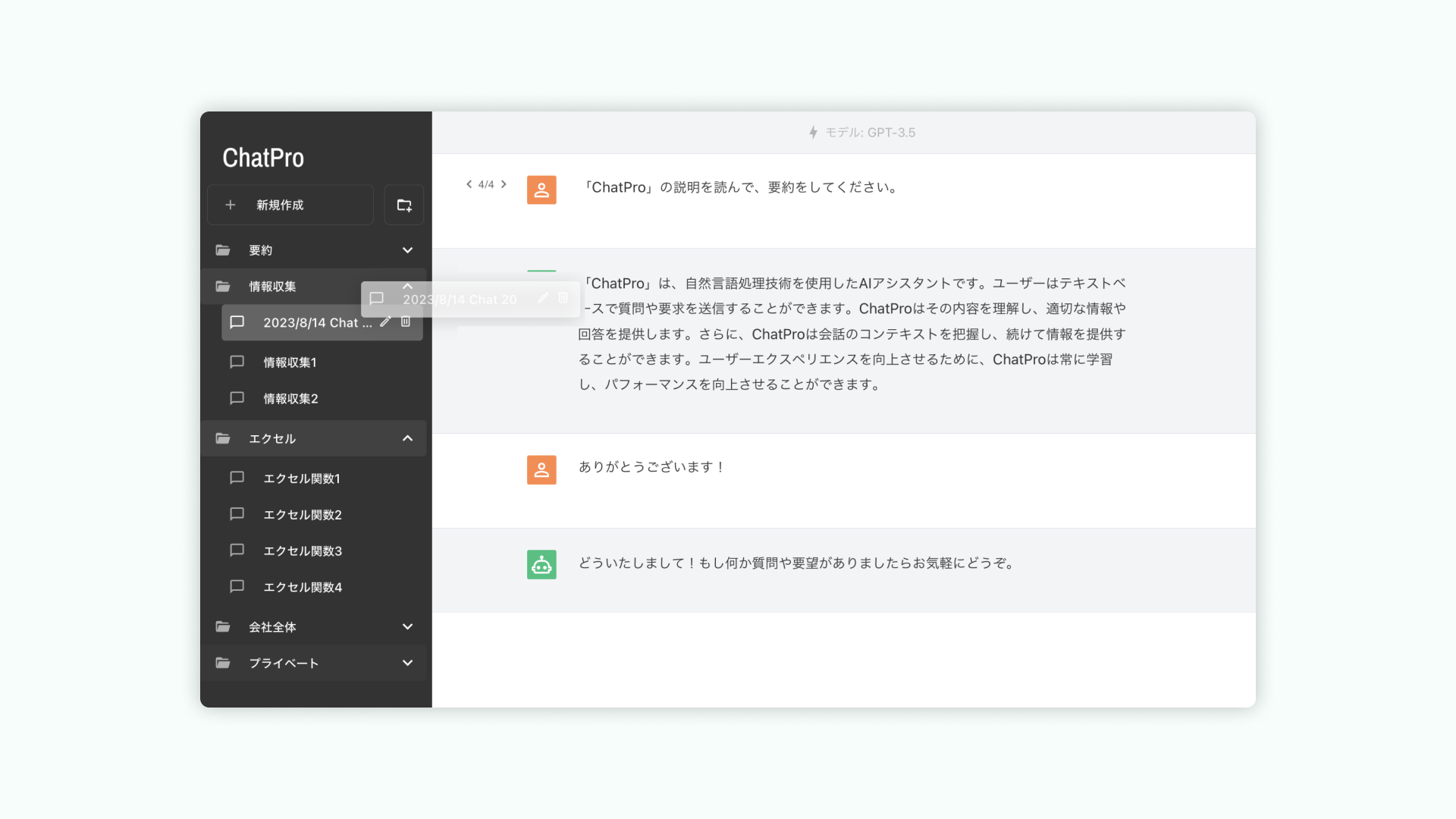 しかし、これまでの「ChatPro」には、AIとの会話を有効に分類する方法がなく、日々の業務で活用するためには不便になっていました。またOpenAI社の提供するChatGPT自体にもそのような機能は現在(※)なく、同様の不便が存在します。この度、そのような要望を踏まえた機能の実装とリリースを決定しました。