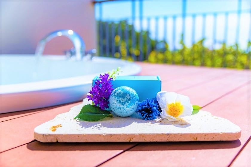 バタフライピ―で着色されたバスボム。客室からの景観と、青い湯舟に浸かりながら、沖縄らしさを体 験できます。お土産としてお持ち帰りいただくこともできます。