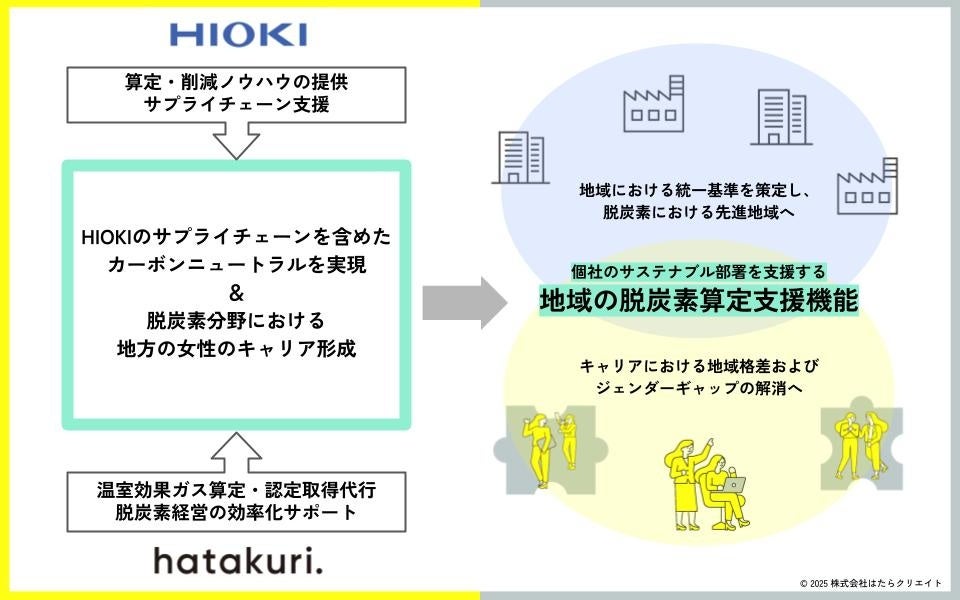 本連携協定により、HIOKIはサプライチェーン支援を強化するとともに、地域企業への脱炭素に関する知見を提供。はたらクリエイトは、HIOKIのサプライチェーン支援への参画を通じ、温室効果ガスの算定代行や中小企業版SBT認定取得支援など、脱炭素経営を実行するためのサポートを行い、女性のキャリア形成につなげます。