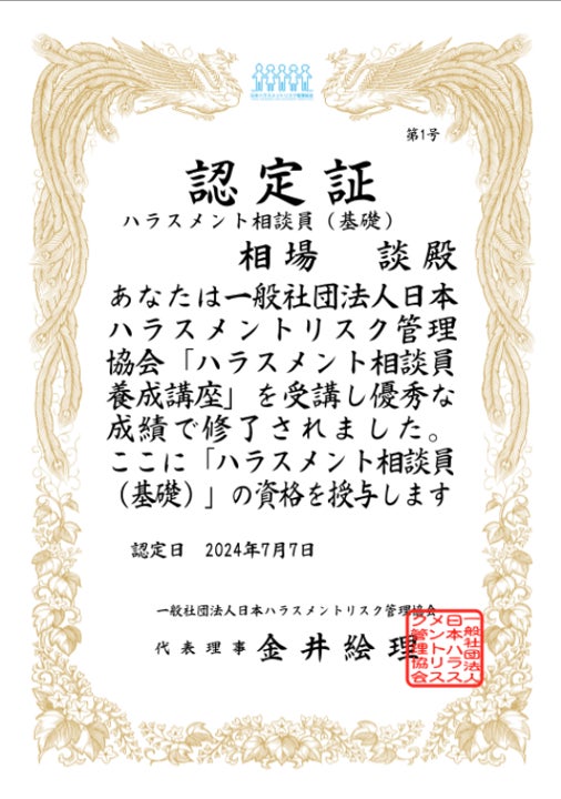 講座受講後、試験に合格すると「ハラスメント相談員(基礎)」の認定証を進呈します。