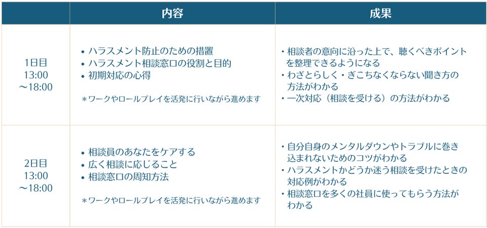 内容は、ハラスメント防止に関する法律や事業主の防止義務/相談を受けた後の対処の流れ/ハラスメント相談の流れ/相談員自身の心を守るなど「ハラスメント相談を受ける」ことをトレーニングします。