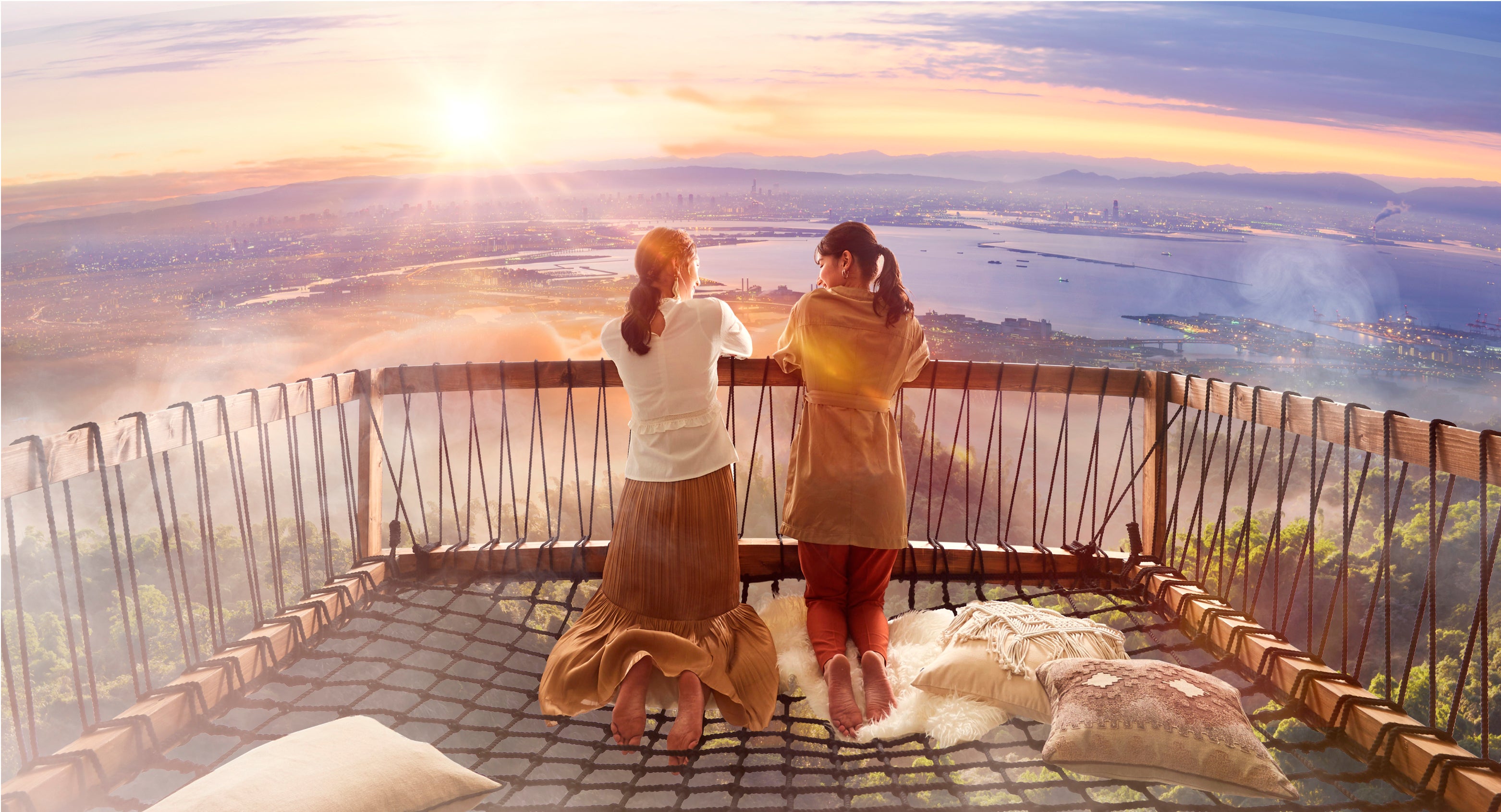 日本屈指の六甲の絶景をひとり占めしたい願望を満たすのが、独自開発したSKY COTTAGEにある「ハンモックテラス」。このテラスからの眺めは、360度絶景に包まれながら、まるで鳥になったかのように、六甲の山から神戸・大阪湾とその周りに広がる都会を見下ろせます。この大自然と一体になる憧れの体験は、ここでしか味わえない日本唯一のもの。