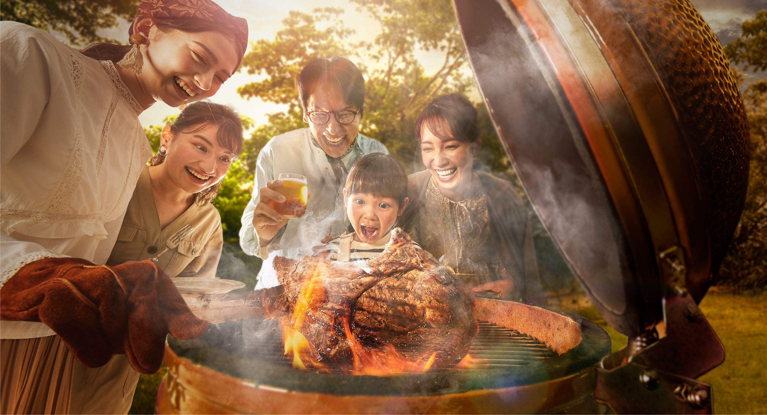 アウトドア・グランピングの最高潮は食体験。ネイチャーライブでは、用意された食材を温めるだけの調理とは一線を画し、誰もが自分で、大きな本格かまどを駆使して大胆に炎を操り、豪快な肉塊をおいしく焼きあげることができます。“グランピング・アテンダント”が丁寧に手ほどきをするので、初心者でも失敗なく調理できます。肉塊だけでなく、新鮮な瀬戸内の魚介や旬の六甲山系のオーガニック野菜など、地場の食材をふんだんに取り入れた野趣あふれるアウトドア料理を、大切な人と協力して作りあげていく体験こそが、ネイチャーライブが追求するキュイジーヌ・グランピング体験です。