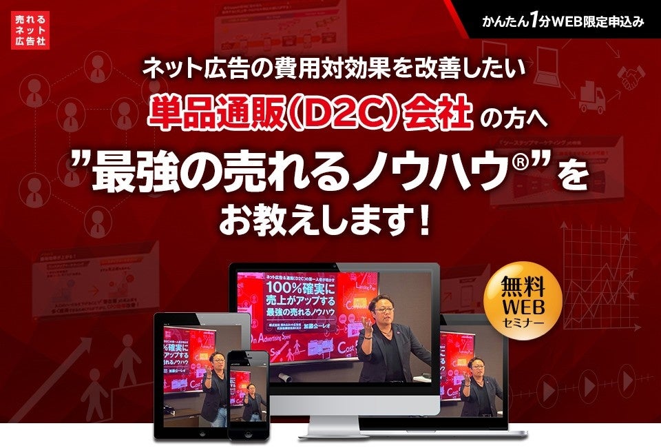 「ネット通販(D2C)」×「ネット広告」に特化したクラウドサービスおよびコンサルティングサービスを提供する株式会社売れるネット広告社(代表取締役社長 CEO:加藤公一レオ、本社:福岡県福岡市)は、2022年2月1日(火)からネット広告の費用対効果を改善したい単品通販(D2C)会社の方向け無料Webセミナーを開催する。