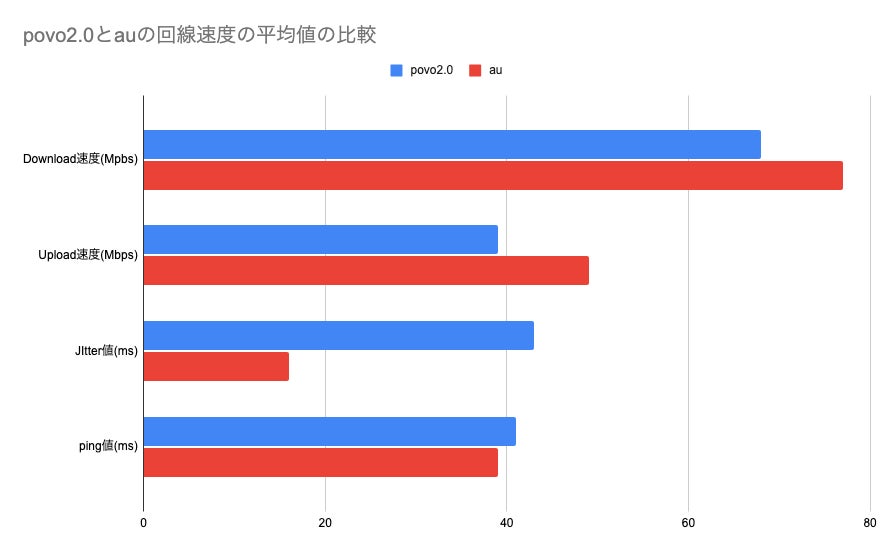 Upload速度:povo2.0の速度はauの速度の約79.6%のスピードが出ている
