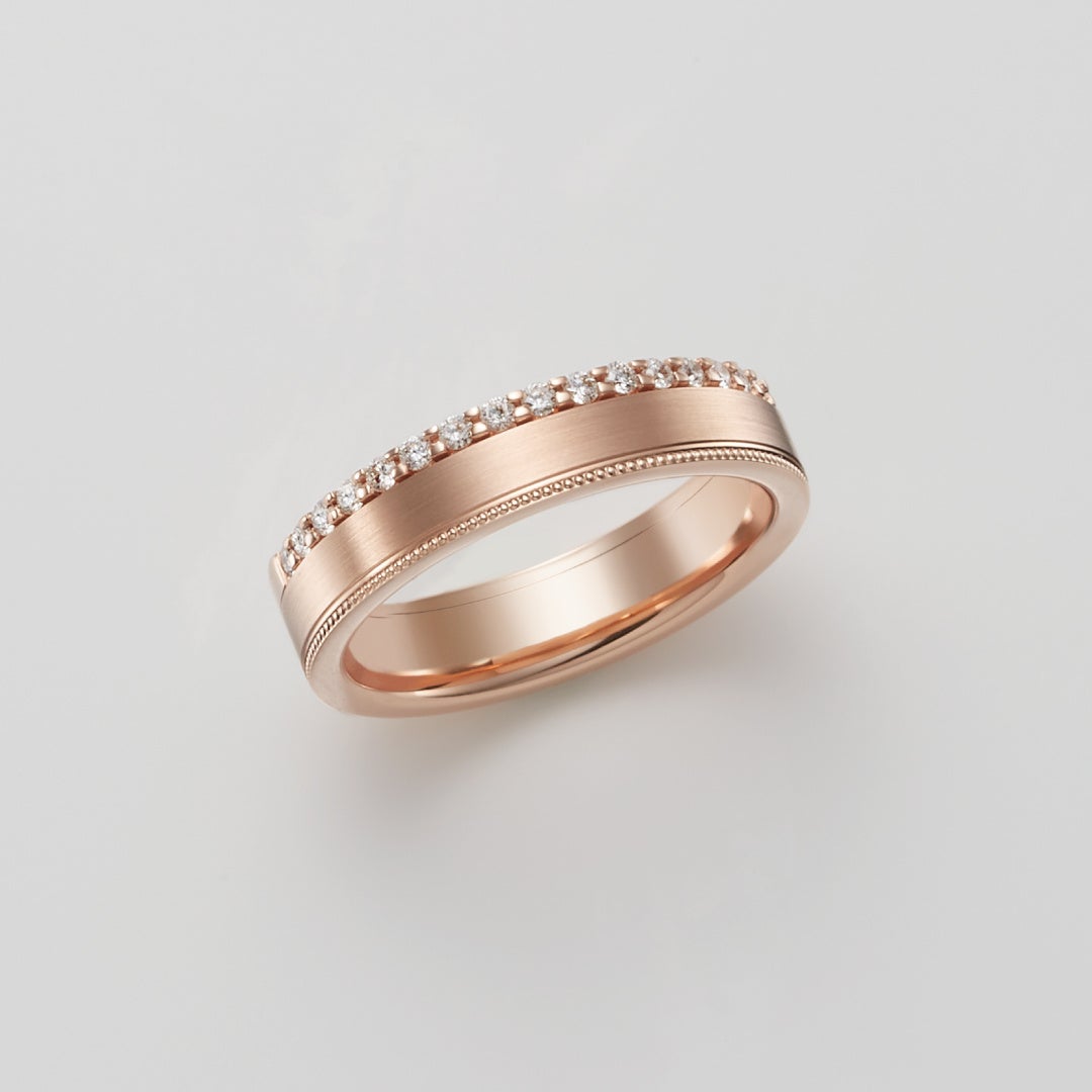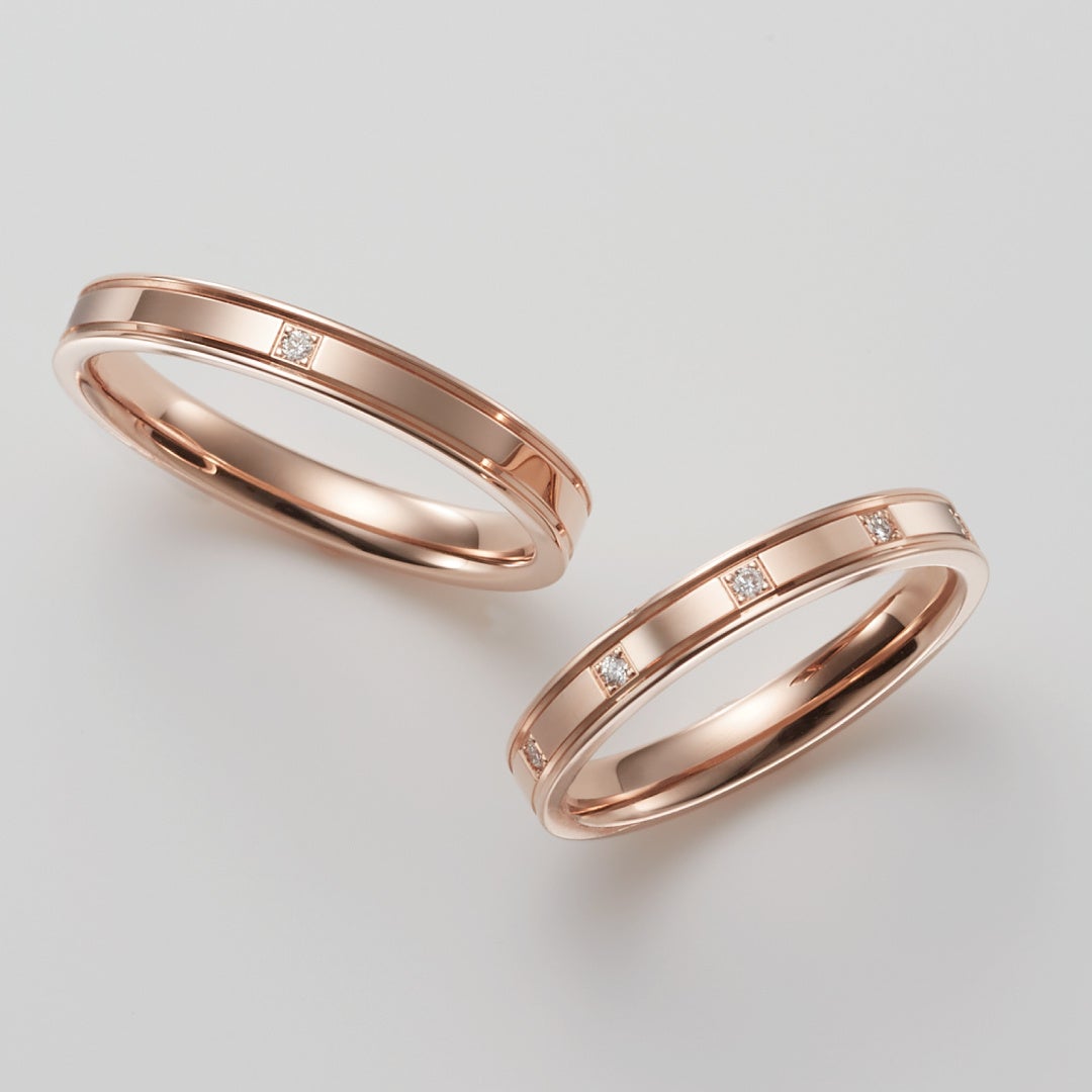 艶めくレッドゴールドが印象的なマリッジリングは、ストレートに施された2か所の溝がスタイリッシュな印象を演出。等間隔に配された5石のダイヤが上品に煌めきます。