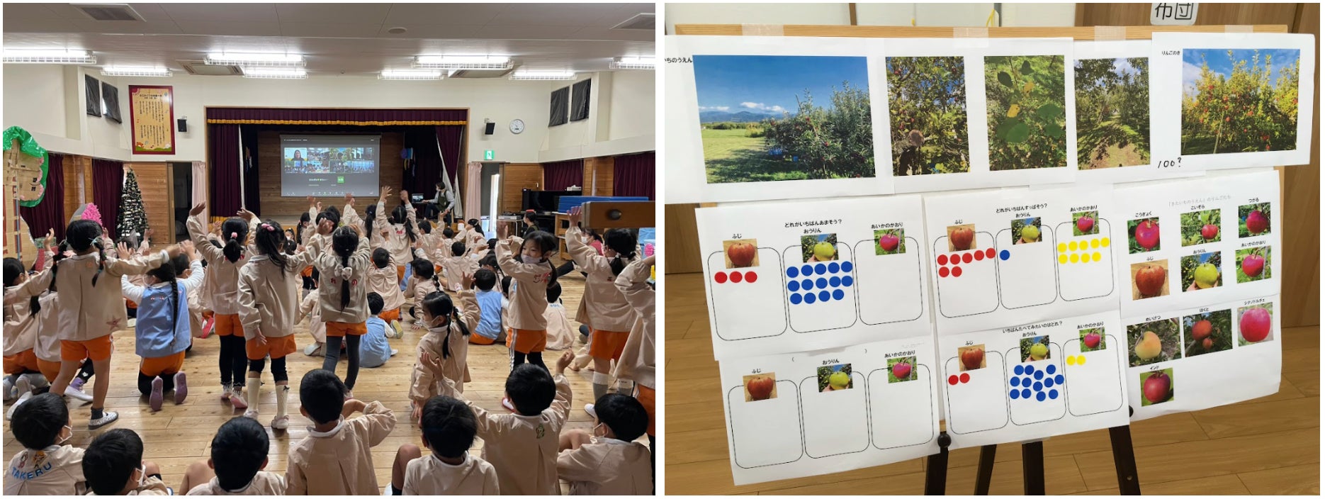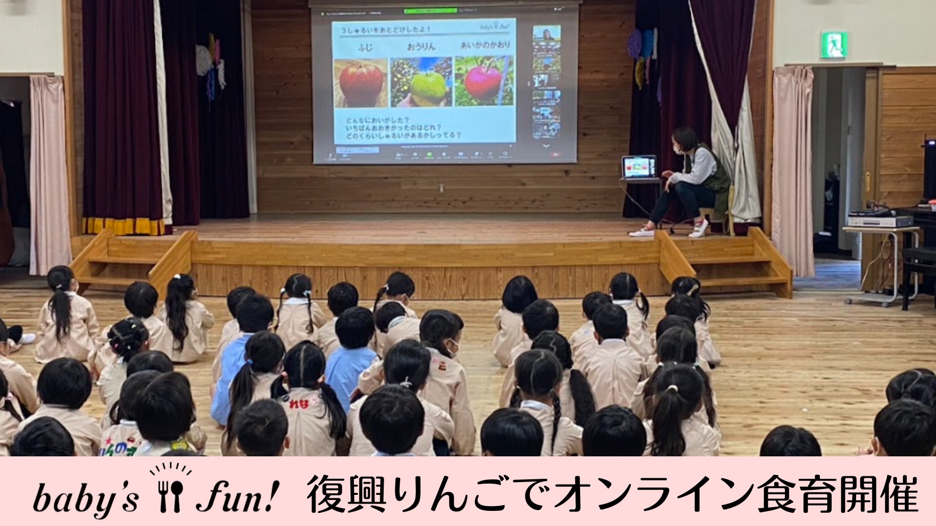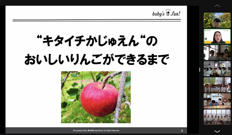 保育園給食を作業効率化する食材キットbaby’s fun!を運営する株式会社sketchbook(所在地:東京都目黒区、代表取締役:多田出 昇、以下「baby’s fun!」)は、長野県にある台風被災地りんご農家のキタイチ果樹園(所在地:長野県長野市、代表者:北澤一樹、以下「キタイチ果樹園」)と共同で、幼稚園や保育園、認定こども園9園の園児に向け『りんご』をテーマとしたオンライン食育を開催いたしました。園児たちは減農薬で皮まで食べられるりんごの食べ比べや美味しいりんごができるまでの生産過程、台風被害のお話しなど身近な食材である『りんご』についての新たな発見や農家さんとの交流などを楽しみました。