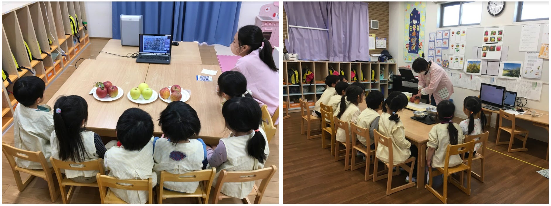 ・実際に繋がったことで子どもたちは喜んでいました。また、コロナ禍で実際に物に触れたりなかなかできない中、今回実際に香りを嗅いだり触ったりできたことで子どもたちの感性も豊かになったと思います。当日玄関にりんご(一玉と半分に切ったもの)を置いておくと、お迎えに来られた保護者様も実際に香りをかいでみたりお子様と楽しく話をされたりと良い時間を頂く事が出来ました。ありがとうございました。(土原の丘保育園 園長)