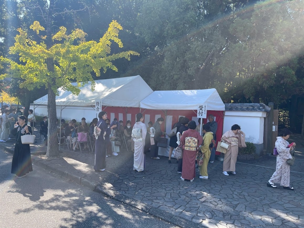 当日も、日本庭園正門前 総合受付と護國神社境内の案内所、2か所の受付テントで、午前9時から先着順で茶券を一般販売いたします。無くなり次第受付を終了いたします。