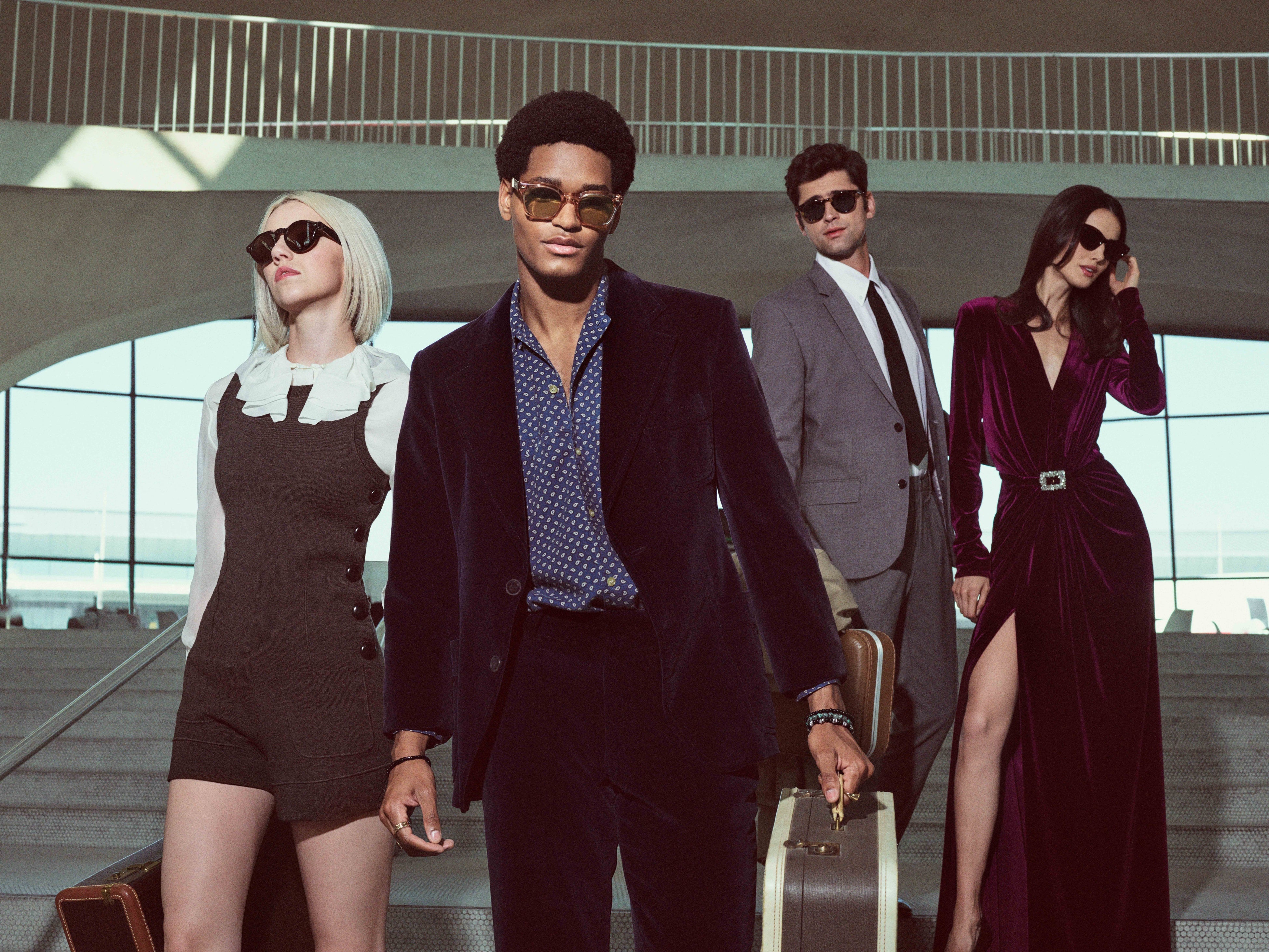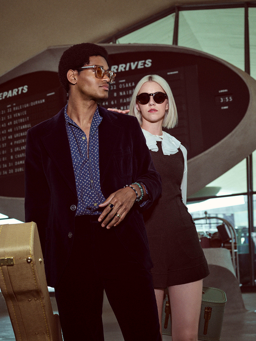 「Nineteen Sixties」(ナインティーン シックスティーズ)は、民間航空の登場で高まる期待とオリバーピープルズにインスピレーションを与えた1960年代の独特の感覚へのオマージュです。このキャンペーンでは、空港を行き交うカリスマのオーラを纏った登場人物が描かれています。俳優ロイ・ハートと女優ソフィア・ハートの美男美女夫妻が空港に到着すると、パパラッチとファンが集まり、騒然とした雰囲気に包まれます。その様子を、パイロットのウィラ・ヴァイパーとそのクルーが驚きの表情で見つめながら通路を歩いて行きます。ロックスターのスキナー・“レイ”・ジョーンズがギターを片手にアーチ形の階段を下りてくると、ソーシャライトのシンディー・サンセットはその姿を一目見ようと公衆電話のブースから飛び出します。そんな登場人物たちの人生が、空港のアナウンスをきっかけにぶつかり合い、物語が動き出します。