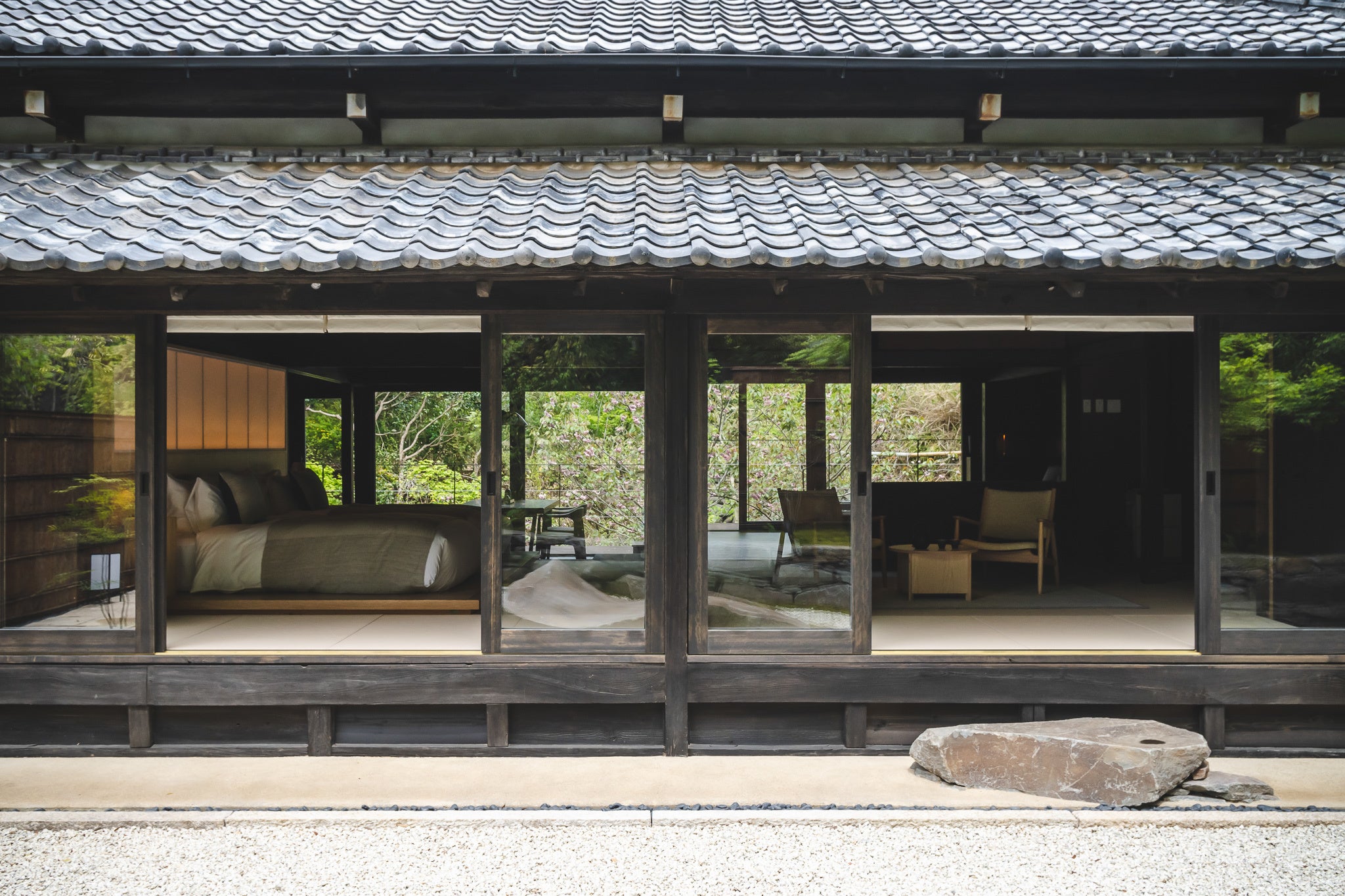 2021年4月にオープンした「LOQUAT西伊豆(以下、LOQUAT)」。約 300 年前より続いてきた土肥の名家の美学を残したお屋敷をリノベーションし、ラグジュアリーな空間へとプロデュースしました。「蔵」は、1 日 2 組限定で客室露天風呂付きの贅沢な滞在空間へ、「母屋」は地産地消にこだわった食材を使用したイタリアンレストランや、ベーカリー、ジェラテリアを併設して地域に開いた場所に。
