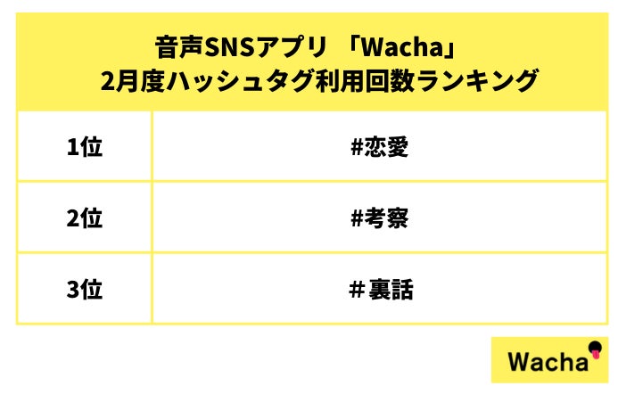 学校や職場では話せないことも気軽に話せる!音声SNSアプリ「Wacha」、2月は恋愛関連の配信が最多!