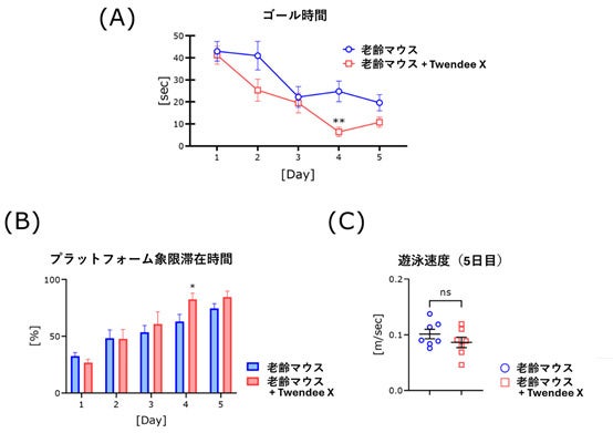 Twendee Xは、老齢マウスの空間学習能力を改善する。Twendee Xを投与した老齢マウス(n = 7)と年齢をマッチさせた対照マウス(n = 7)を用いた。* p < 0.05、** p < 0.01、nsは有意差なし。これらのデータは平均値±SEで示した。ゴールまでの時間のデータは、二元配置分散分析を用いて統計的に評価した。移動速度(水泳)とプラットフォーム四分円での滞在時間の比率は、両側、対にならないスチューデントのt検定を用いて統計的に評価した。