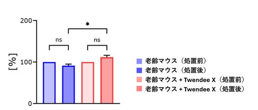 Twendee X投与前後における老齢マウスの相対的なトレッドミル走行距離。各飲料水投与開始前の走行距離を100%とした。n=8。* p < 0.05。nsは有意ではないことを意味する。データは平均値±SEで示した。データは一元配置分散分析にTukey-Kramer検定を加えて統計的に評価した。