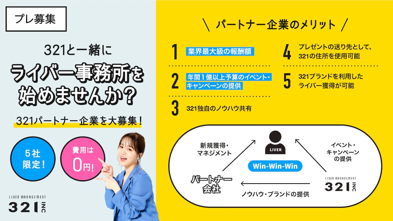 321は、ライバーの発掘・育成を行っていただく「パートナー企業」を募集しています。業界最大級の報酬と、予算1億円以上をかけたイベント・キャンペーンを無償で提供させていただきます。