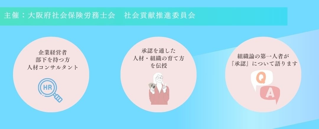 大阪府社会保険労務士会(大阪市北区:会長 大西宗明)は、令和6年3月30日(土)に、大阪市中央区の「國民会館12階大ホール」およびZoomウェビナーにて、無料公開講座『認め合う職場づくりへの提言』を開催いたします。