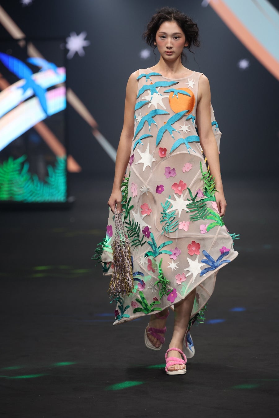 文化融合を得意とするデザイナー、唐宗謙氏は、IPクリエイター、夏仙氏の「台湾日常」のイラストの要素を、星、ツバメ、電信柱、シダ、ニチニチソウなど、台湾特有の自然や都市の風景に分解しました。仕立てや生地の質感、色の使い方などを通じ、モダンでファンタジック、ポエトリーな服を制作しました。身の回りの生活の美しさにもっと注目し、台湾の都市文化と若者らしさを表現したいとしています。