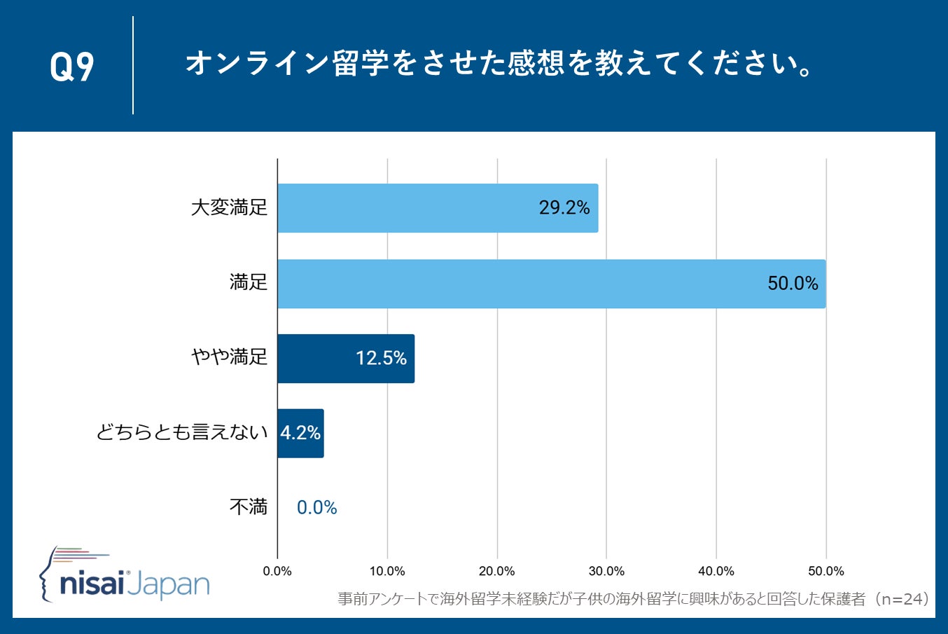 オンライン留学の未経験者は88.9%と多数派でしたが、経験した家庭の79.2%が「大変満足」または「満足」と回答。不満と答えた家庭はゼロという結果から、オンライン留学が質の高い教育の提供に成功していることが示されています。