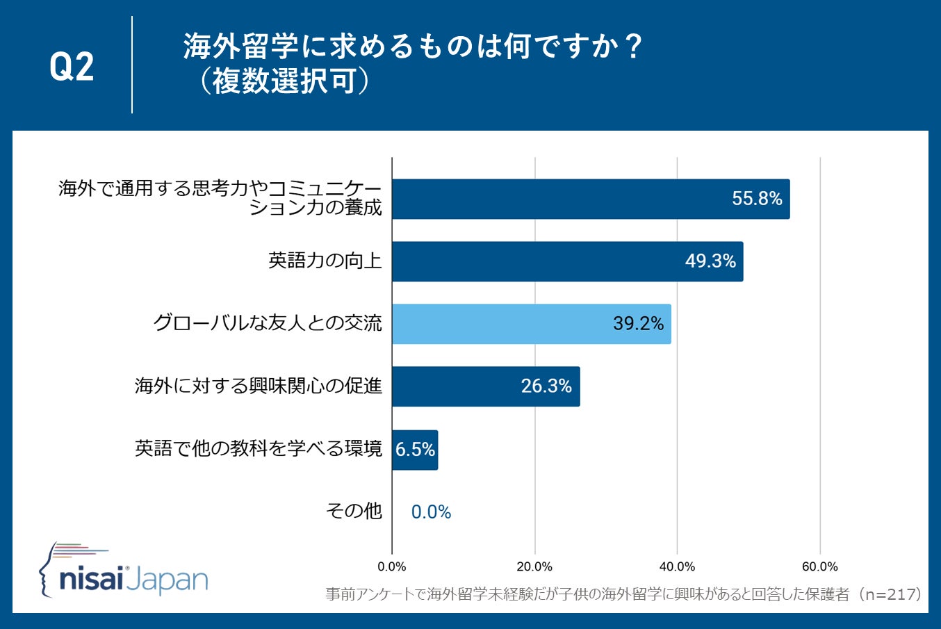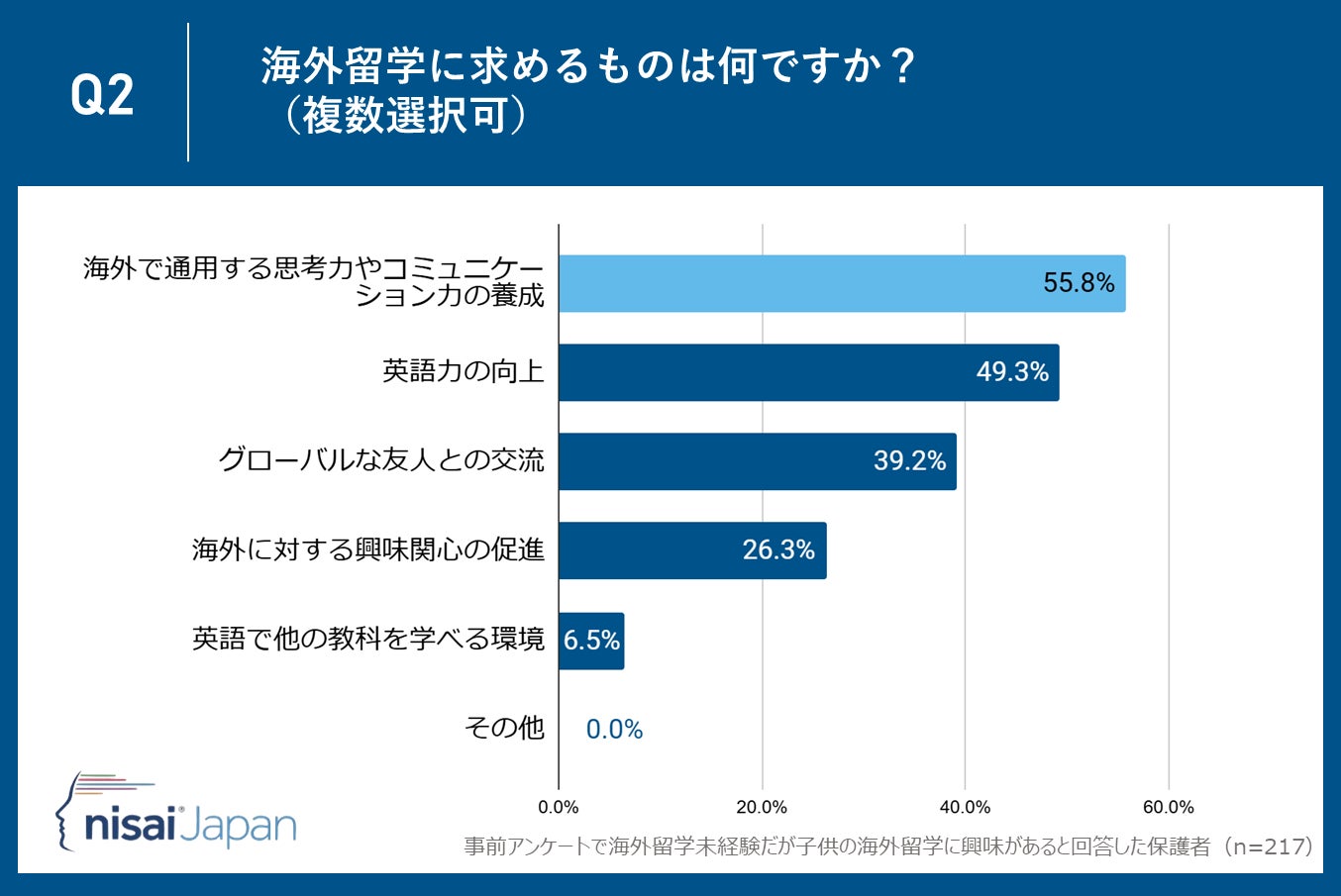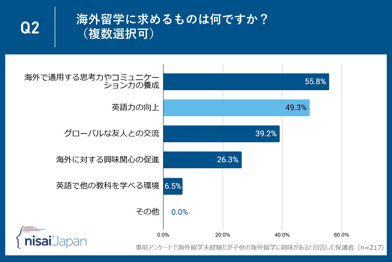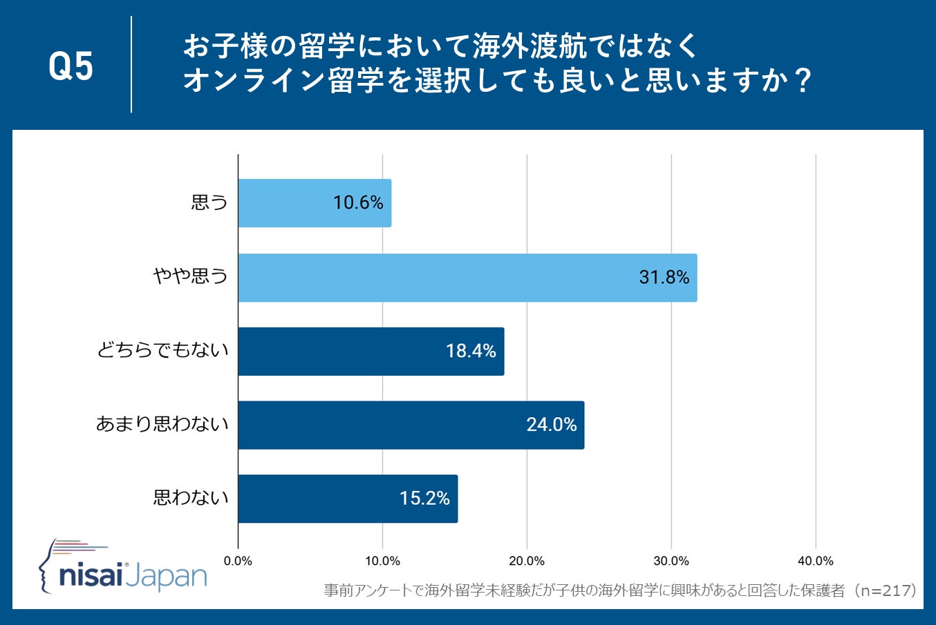 Nisai Japan株式会社(所在地:京都市下京区、代表取締役CEO:Dhruv Patel)が運営するNisai British International Online Schoolは子供がまだ海外留学未経験だが海外留学に興味があると回答した保護者35〜55歳の保護者217名を対象に、「海外留学」に関するアンケート調査を実施しました。