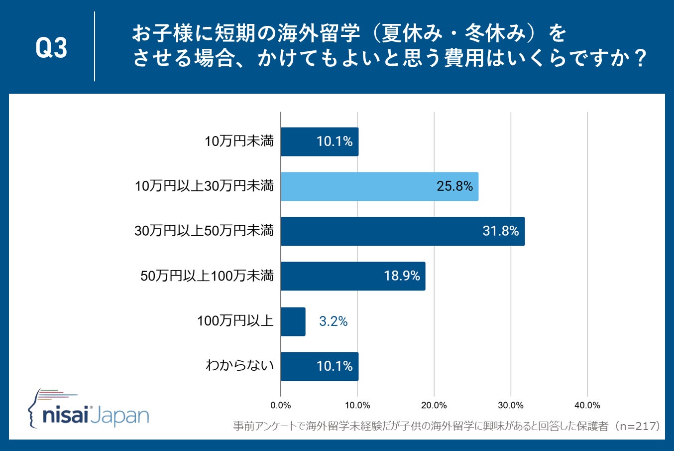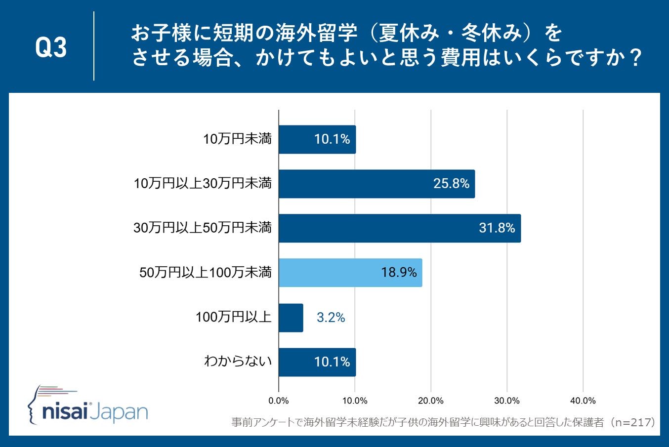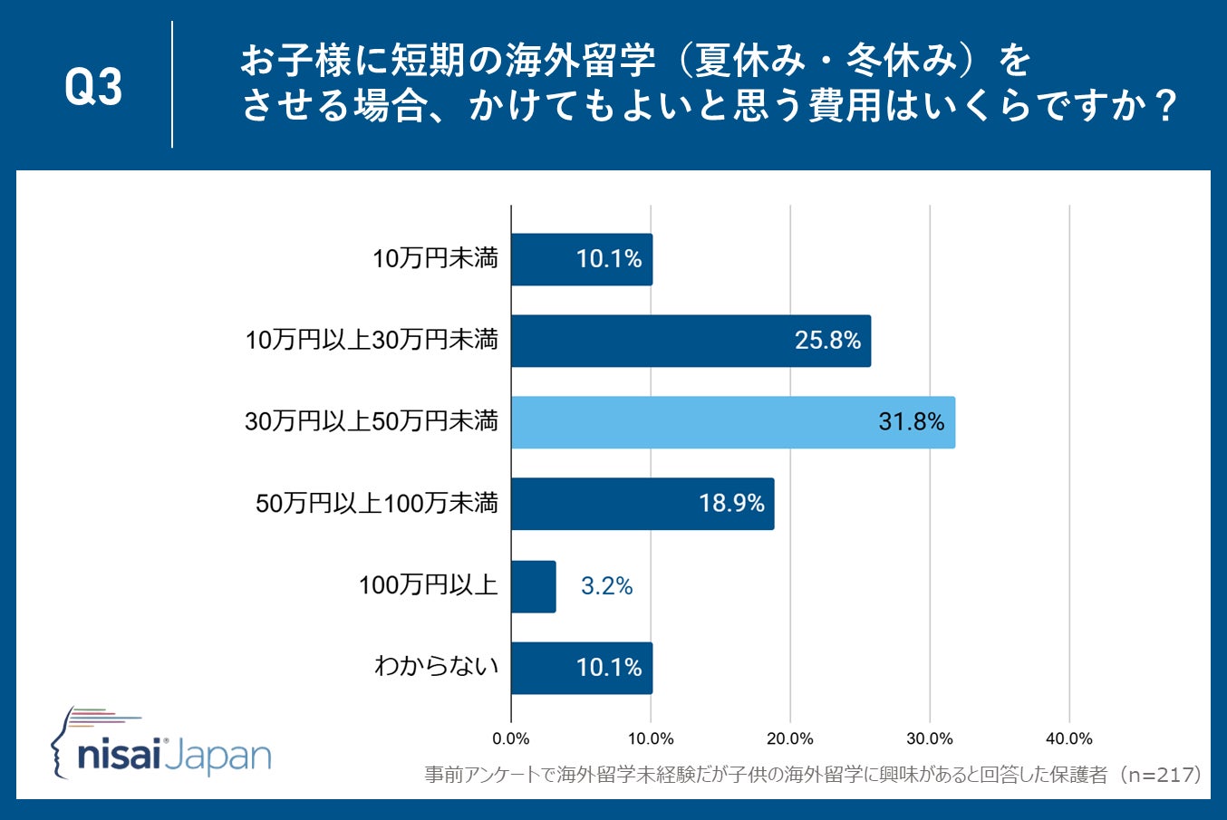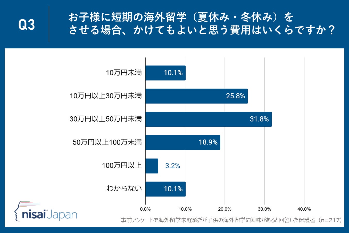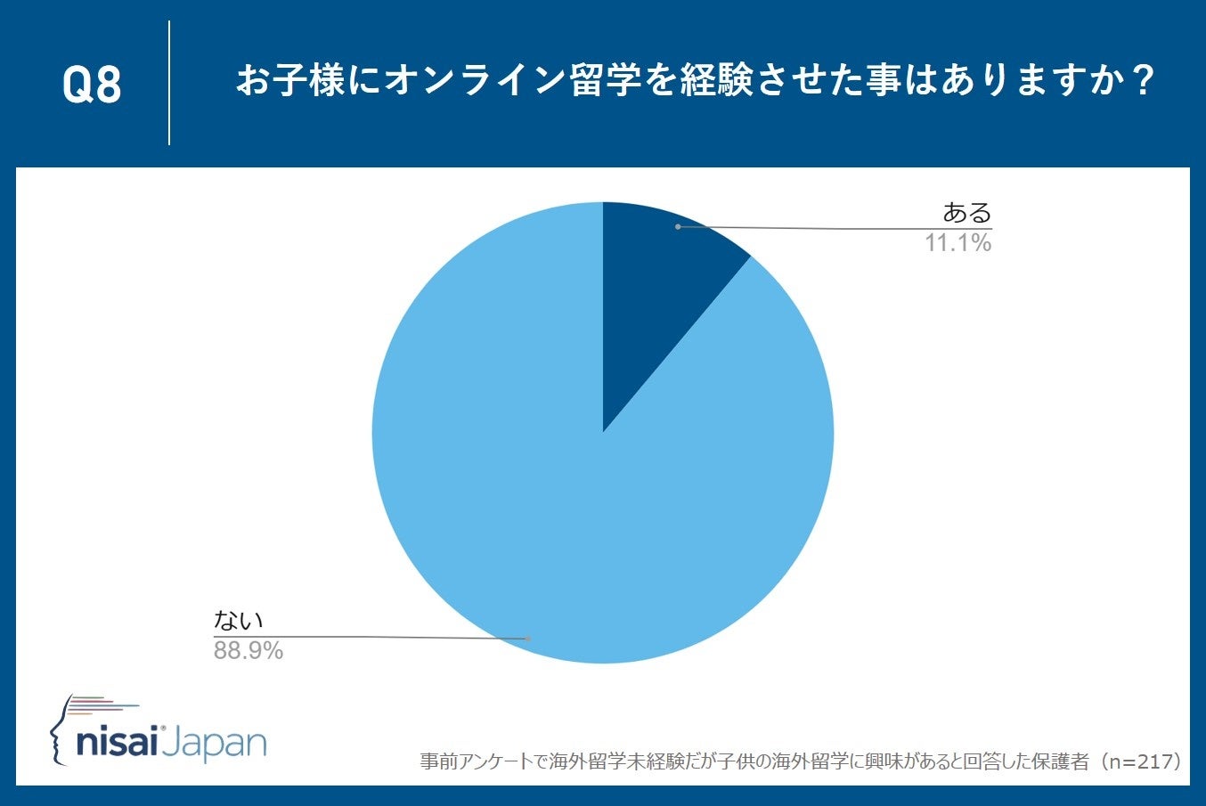 Nisai Japan株式会社(所在地:京都市下京区、代表取締役CEO:Dhruv Patel)が運営するNisai British International Online Schoolは子供がまだ海外留学未経験だが海外留学に興味があると回答した保護者35〜55歳の保護者217名を対象に、「海外留学」に関するアンケート調査を実施しました。
