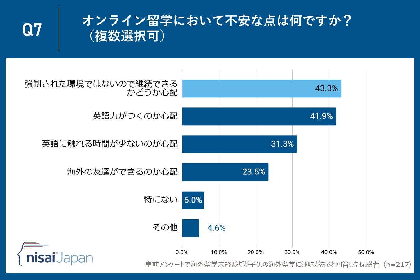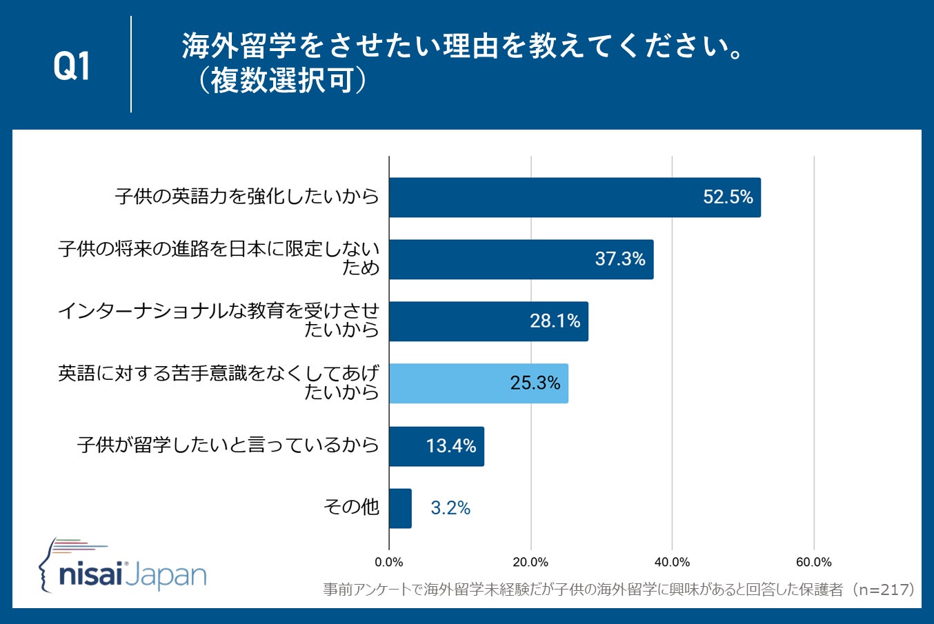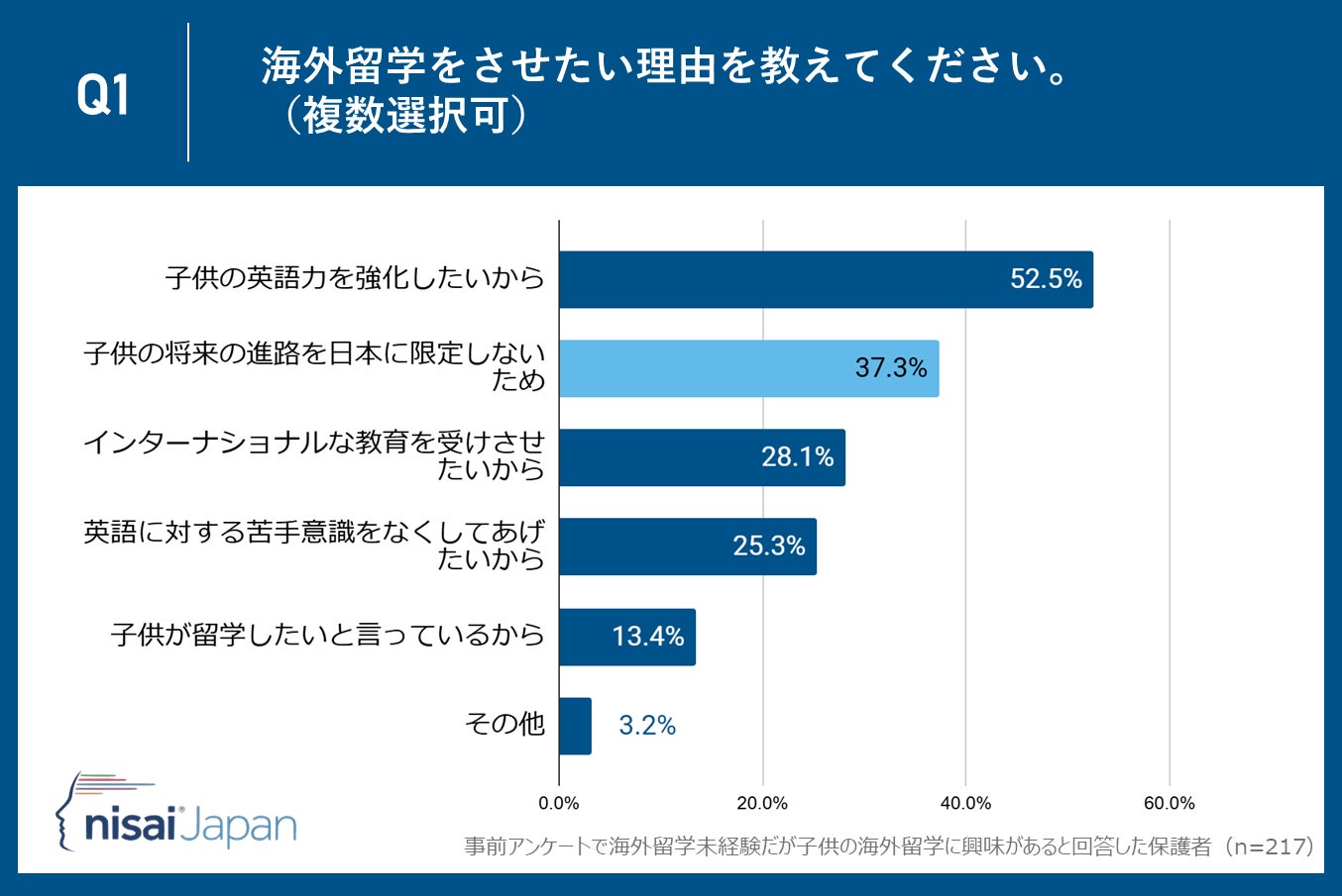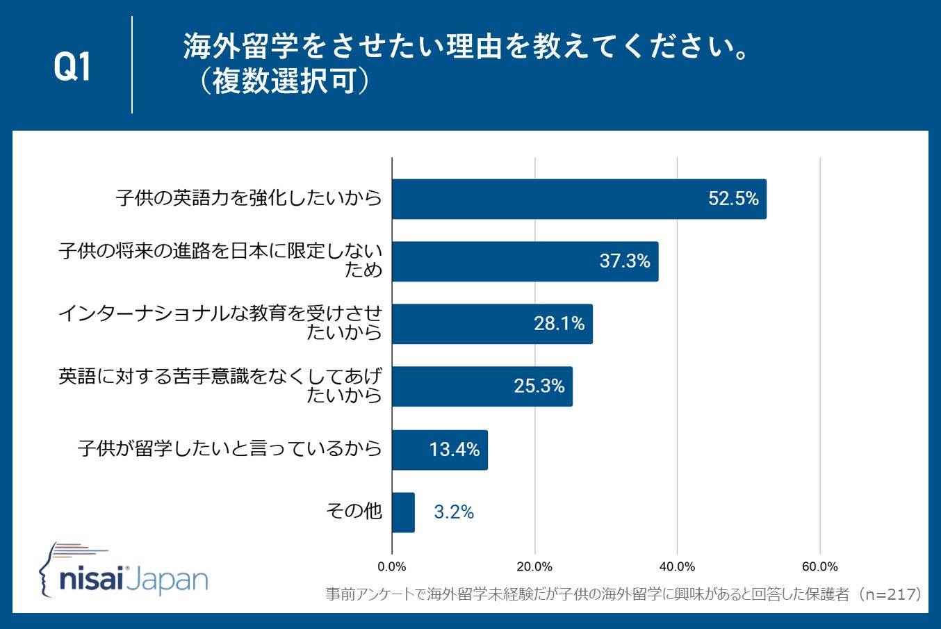 Nisai Japan株式会社(所在地:京都市下京区、代表取締役CEO:Dhruv Patel)が運営するNisai British International Online Schoolは子供がまだ海外留学未経験だが海外留学に興味があると回答した保護者35〜55歳の保護者217名を対象に、「海外留学」に関するアンケート調査を実施しました。