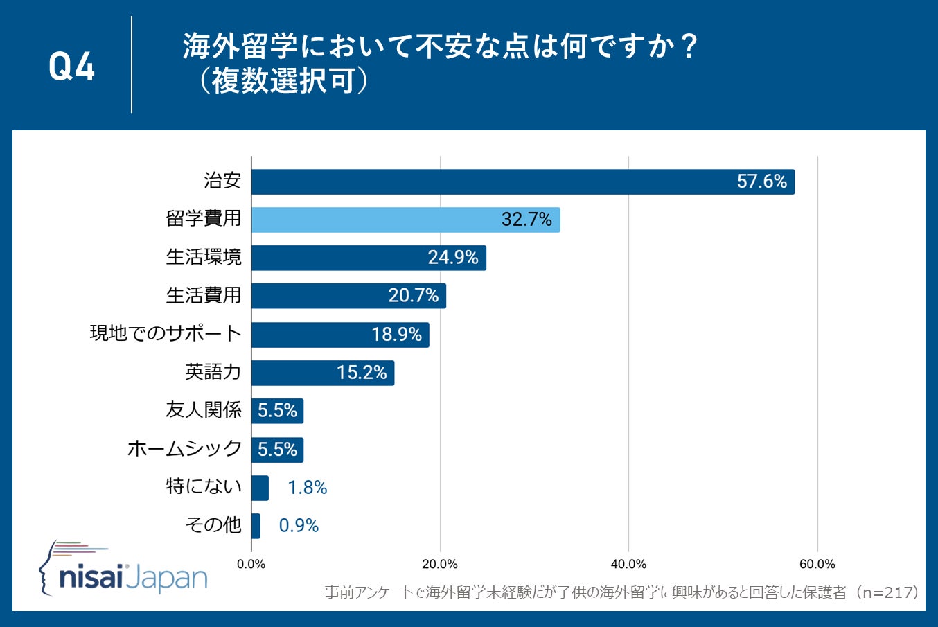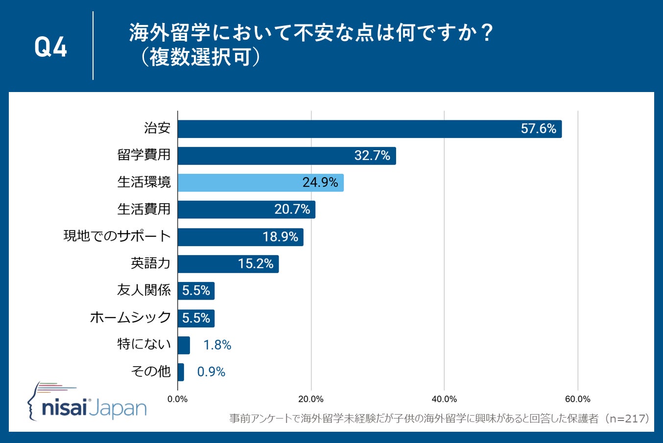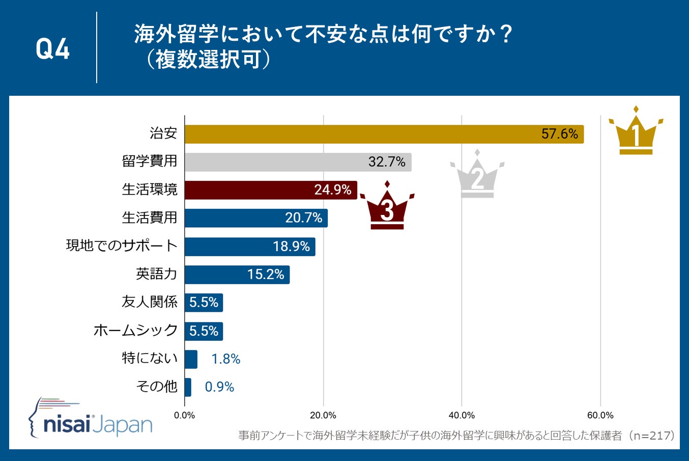 「海外留学において不安な点は何ですか?」という調査では、「治安」が57.6%で最も多い回答となりました。これは、留学先での安全が子供の留学生活を左右する最重要ポイントであることを示しています。