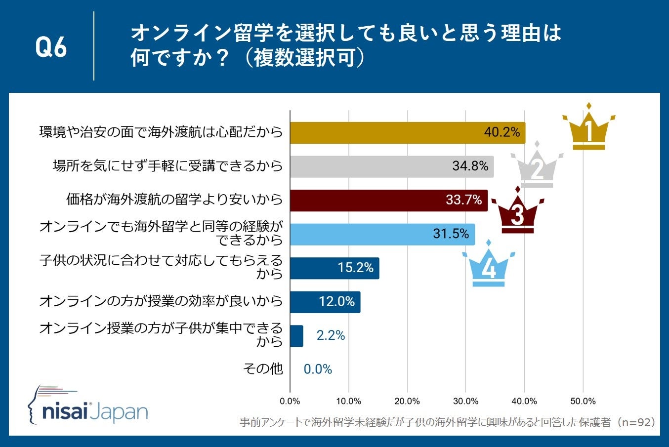 理由1位:40.2%が『治安面の不安』を理由に選択―安心して学べる環境がオンライン留学の魅力