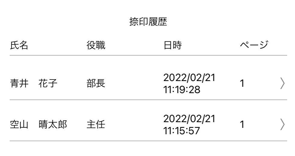 PDF印鑑が付与されているファイルは、[捺印履歴]より、PDF印鑑の履歴を一覧表示で確認できます。