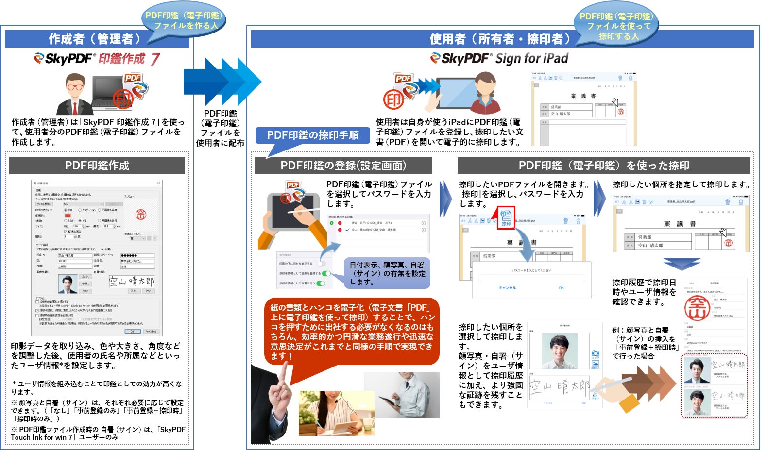 株式会社スカイコム(本社:東京都千代田区、代表取締役社長:川橋 郁夫)は、iPadOS専用アプリケーション「SkyPDF Sign for iPad」のマイナーアップデートに伴い、「SkyPDF 印鑑作成 7」*で作成したPDF印鑑(電子印鑑)ファイルをiPadに設定登録し、表示したPDFファイル上に電子的に捺印できる機能および、捺印後に文書が変更(改ざん・偽造)されていないか確認できる改ざん検知機能を追加しました。