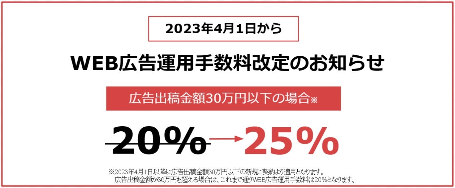 新規ご契約で広告出稿金額30万円以下の場合、WEB広告運用手数料を、従来の20%から一律25%に改定します。