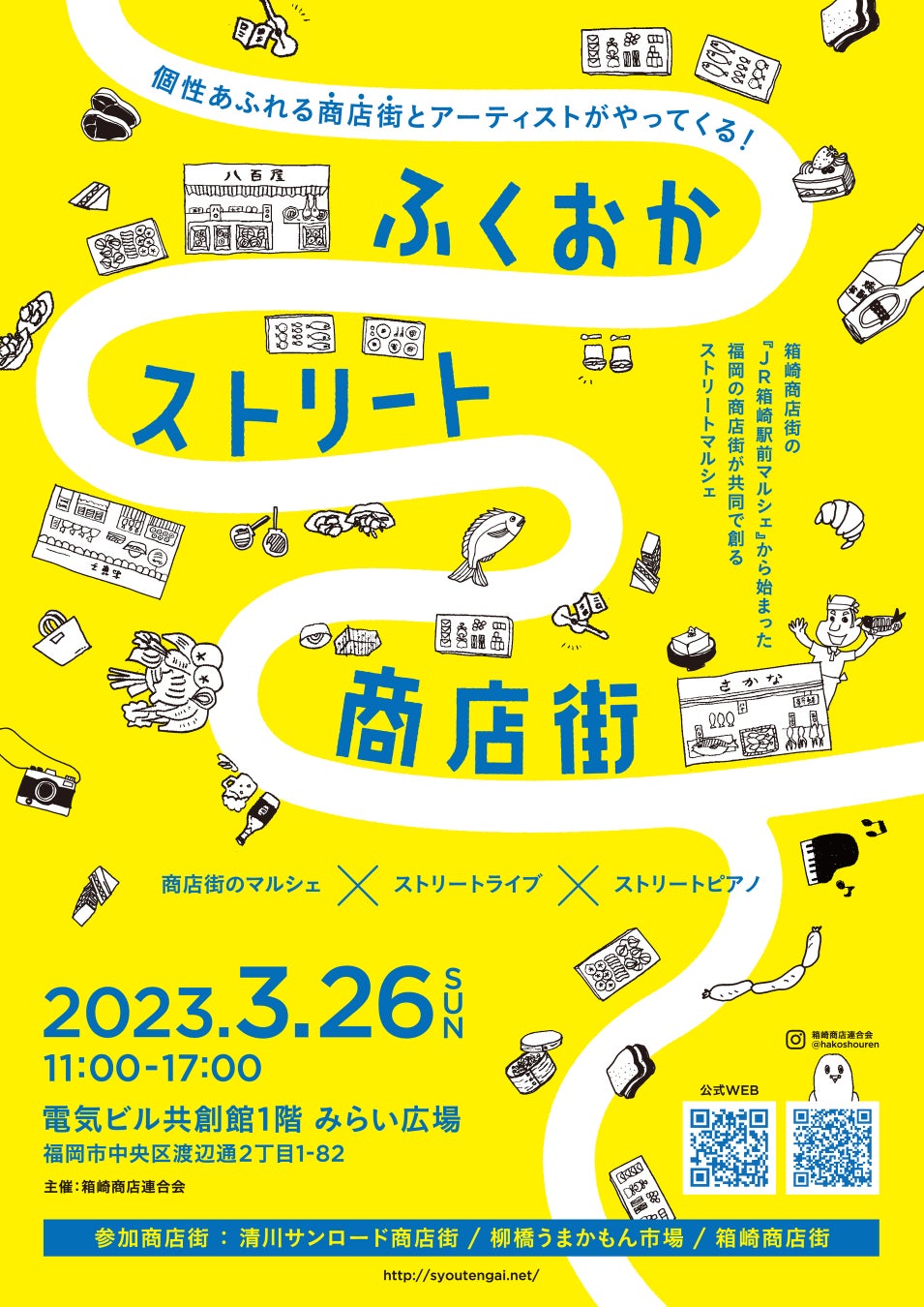 3月26日(日)、福岡・渡辺通りにて、マルシェイベント「ふくおかストリート商店街」を開催いたします。福岡は、およそ100エリア以上の商店街が存在する、ストリートに溢れた街。そんな福岡各地に点在する商店街の中から、個性あふれる3団体が渡辺通りに集結!アーティストによるライブミュージックと共に、活気ある商店街の雰囲気をお楽しみください。(主催:箱崎商店連合会/企画サポート・デザイン・広報:株式会社ダイスプロジェクト)