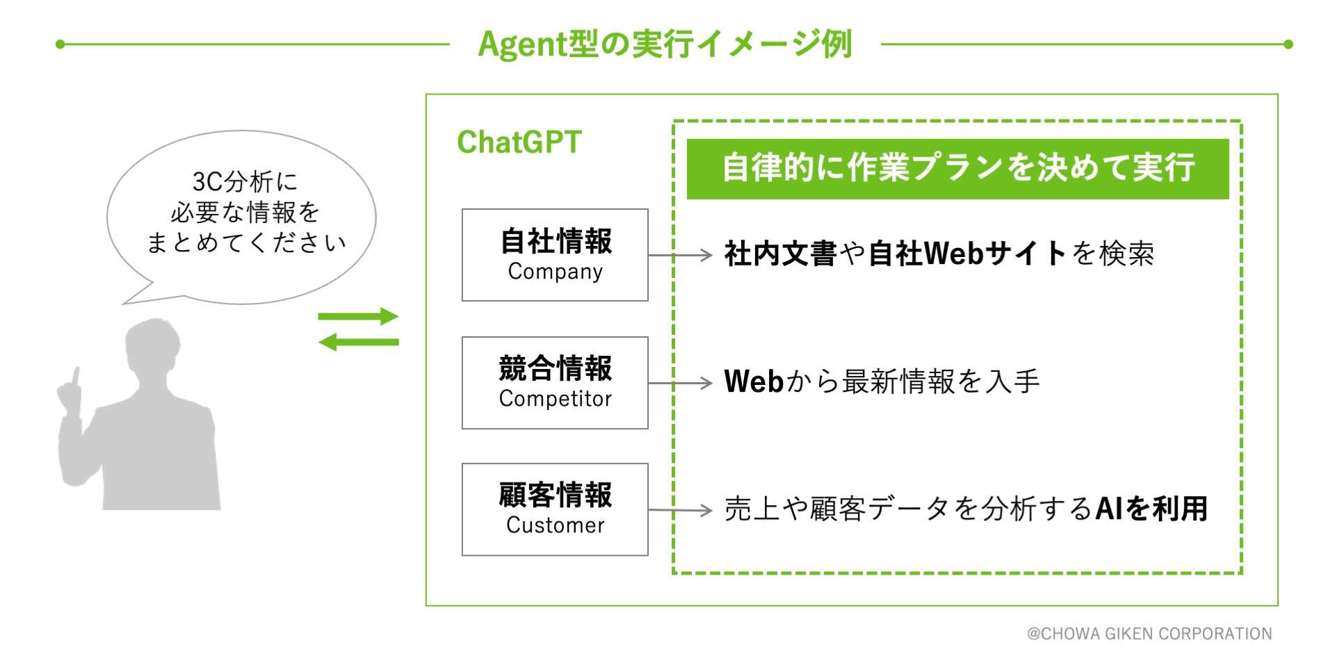 ChatGPTの検索対象をWebや他のAIまで拡張させ、包括的な質問に対してChatGPTが自律的に作業プランを立てて実行するAgent型の実装