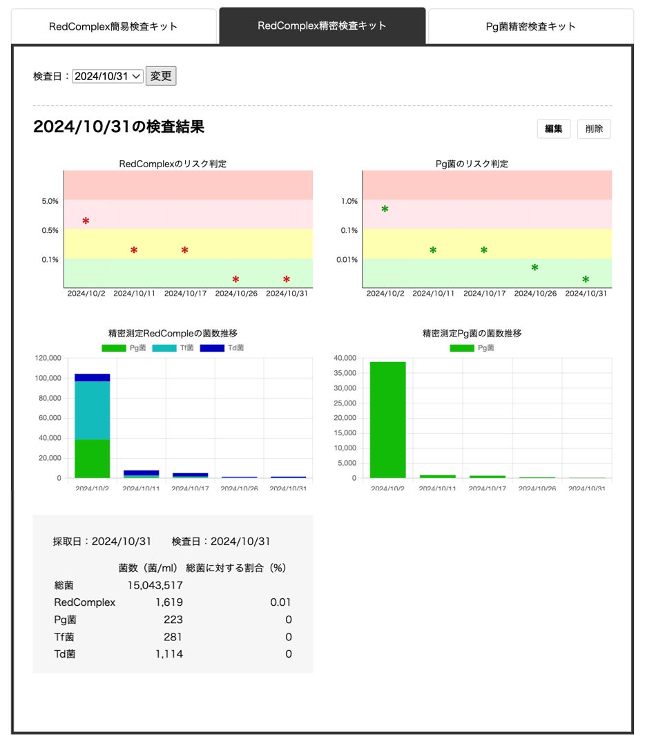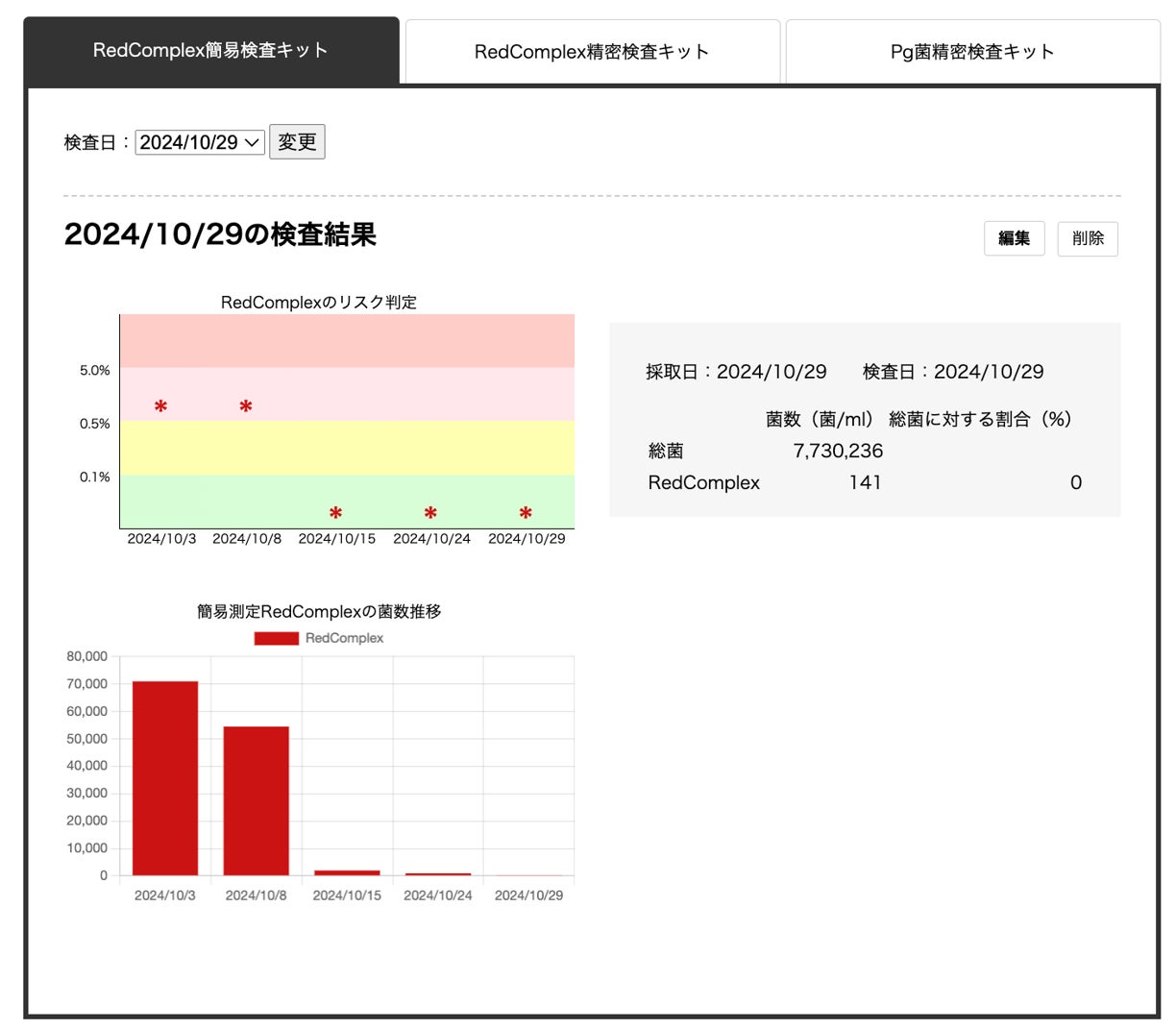 PCR検査の結果を数値入力することで歯周病のリスク判定※3を表示、過去の検査データとの比較や患者向け説明資料の出力も可能なWebシステム。