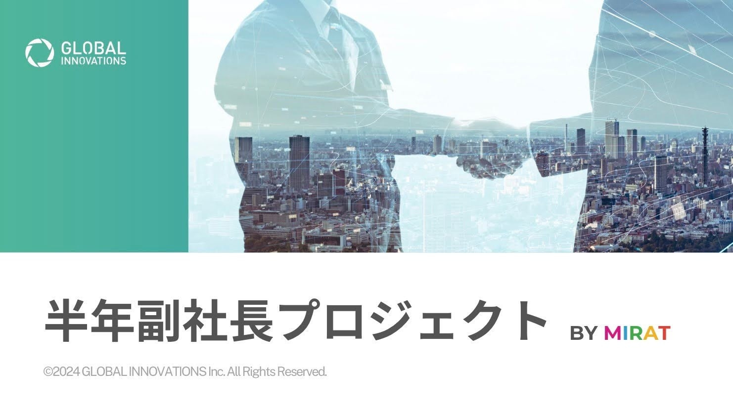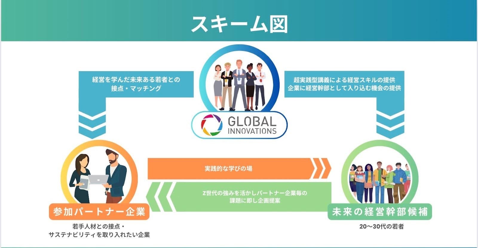 グローバルイノベーションズが育成したサステナビリティ経営のスキルを持った若者と若手人材のリソース不足に悩んでいる企業、両者のマッチングを促進し経営者不足を解決するプロジェクトです。